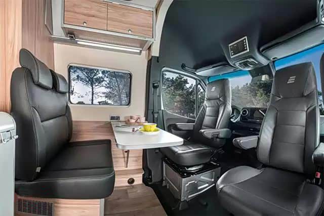 围坐式的客厅去,宽敞的空间感,与目前国内的B型房车相似。黑色的纤维皮质包覆的座椅,宽大厚实,显得非常舒适,同时搭配精致的纹理轻质家具板内饰,更显档次感。