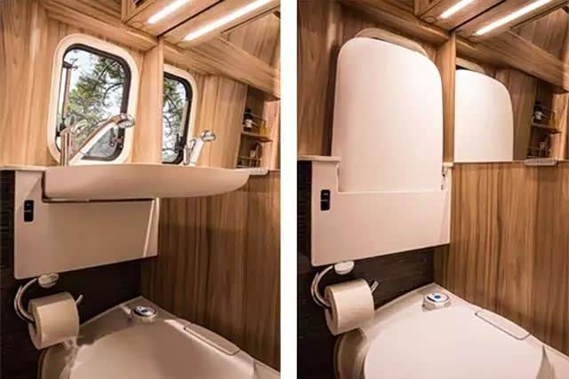 卫生间在第二排座椅后面,卫生间内包含正常浴室应具备的一切:洗脸盆(抽拉式水洒)、镜柜、淋浴设施、通风窗、储物格等。