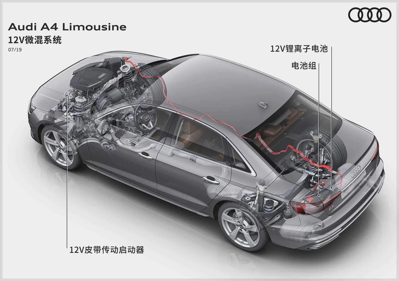 除此之外,新款A4将在大部分车型上配备12V混合动力系统,通过新增电池组和启动电机,可以实现每100公里减少0.3升的燃油消耗,同时稍微优化行驶体验。