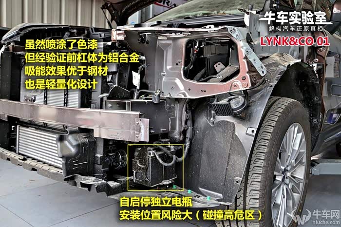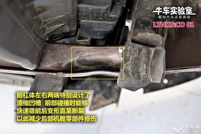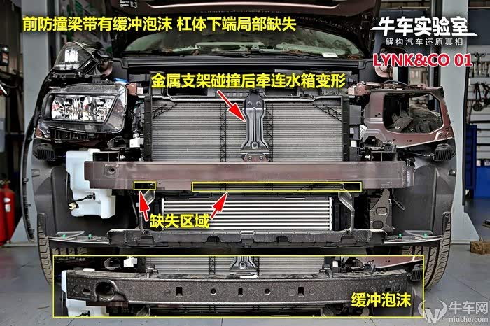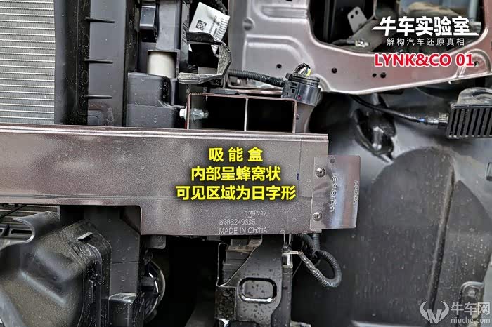 领克01前防护梁单薄且中间缺失,有缓冲泡沫,杠体左右两端设计特殊溃缩槽。优势在于杠体采用铝合金材质,吸能好且轻量化。防撞梁上方用金属支架连接水箱框架,和VV5如出一辙。杠体内部并无特殊吸能结构,后方吸能盒体积超大且内部为蜂窝状,吸能效果比传统造型更好。车头左下角单独安装一个自启停电瓶,发生前部碰撞时损坏几率较大。