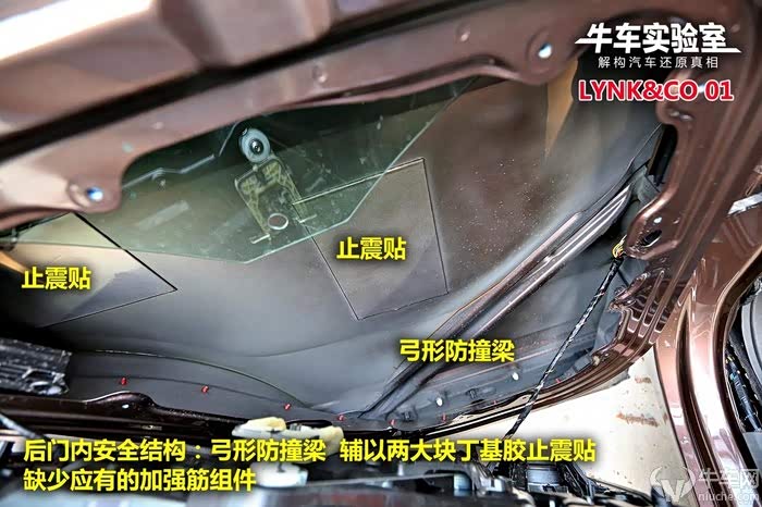 领克01前后车门内饰板均贴合大面积原生隔音棉,后门特别设计了隔音泡沫,线束防护为绝缘布。车门采用一体冲压工艺,美观度好。车门防水层采用树脂材料密封,给维修拆解带来困难,但密封效果好。前门内部采用弓形防撞梁辅以一道加强筋,止震贴为无异味丁基胶,后门为弓形防撞梁且没有加强筋,止震材料同样是丁基胶。四门框焊点差距较大,前门稀疏无规则,最稀每延米焊点8个最密也仅有18个,后门每延米焊点18个,非常稀少。