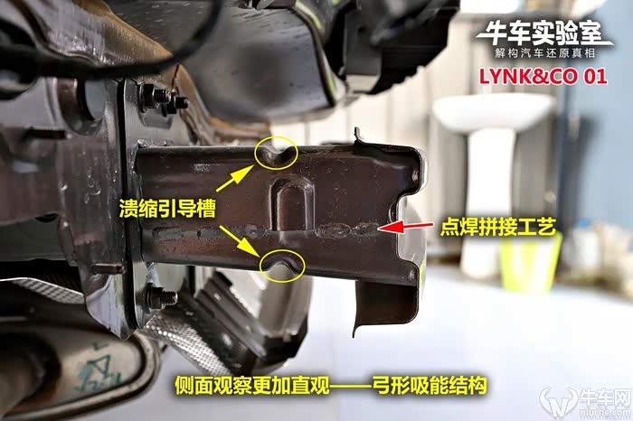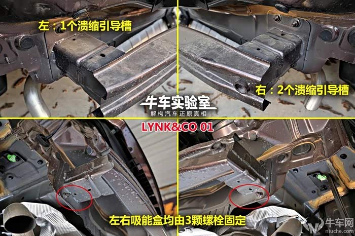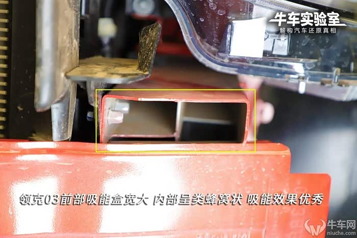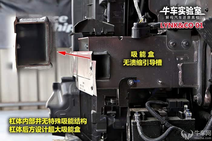 领克01和领克03的后部结构几乎一样,都是比较普通的设计结构,且固定螺丝均缺少一颗。但是领克03的吸能盒长度明显小于领克01。