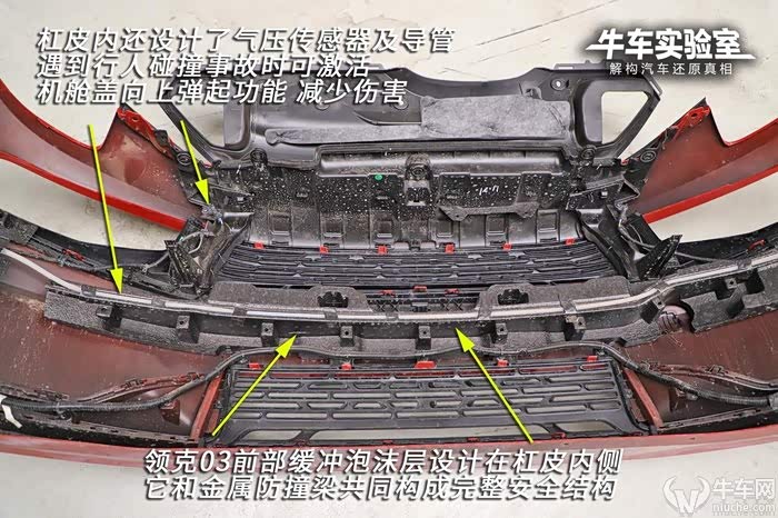 领克01前杠铝合金材料,吸能盒是蜂窝状铝合金,带有特殊的缓冲压溃槽;领克03同样采用铝合金杠体和吸能盒,但没有涉及特殊的压溃槽,升级的地方是前杠内设计了气压传感器,是机舱盖主动弹起功能的触发装置。