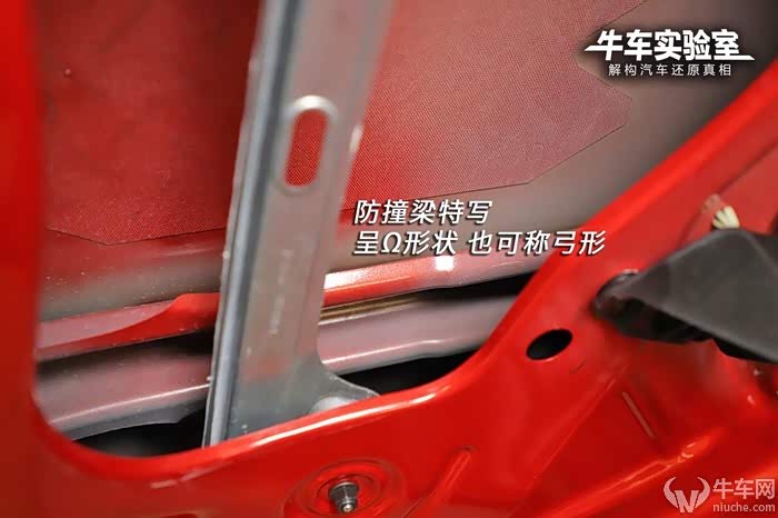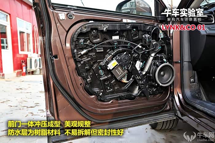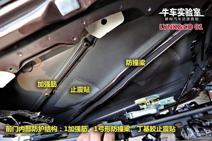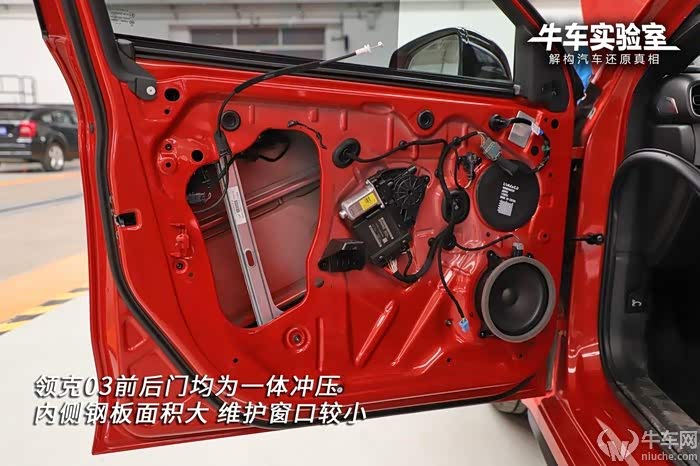 领克03车门均采用美观度更好的一体冲压工艺制成,内侧钢板面积较大,相应的维护口较小。前门内部设计一道加强筋,一道Ω形状防撞梁,另外顶端辅以宽大加强结构,沥青止震板面积也较大。