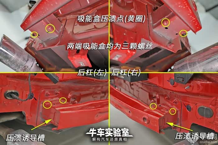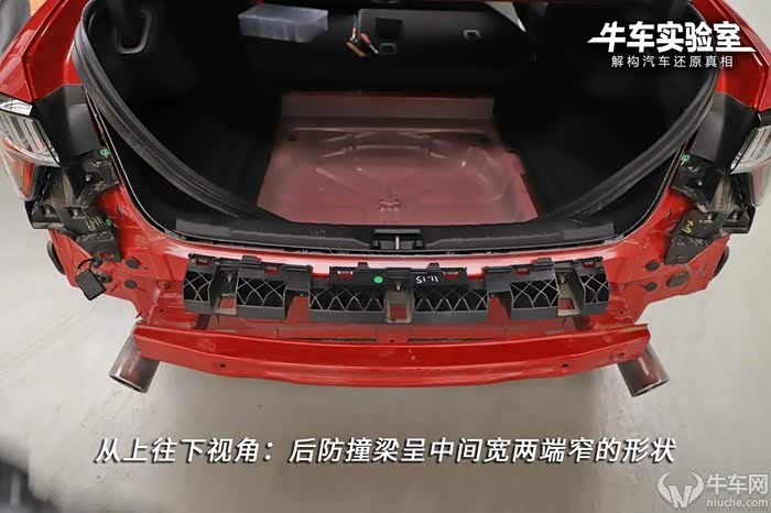 后部并无设计泡沫吸能层。后杠吸能盒仅有一道压溃诱导槽,但设计了多个压溃点,可以起到相似的溃缩作用。后杠体两端均为三颗螺栓连接,虽无伤大雅但的确节约了微小成本。