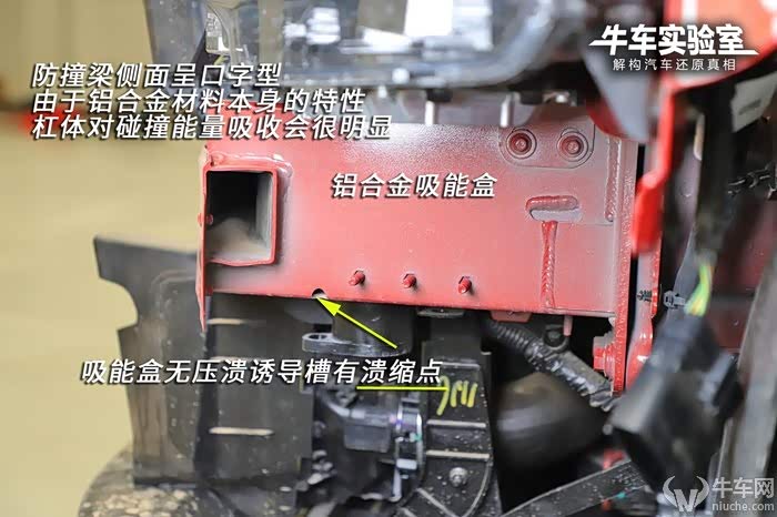 铝合金吸能盒呈类蜂窝状,提升了吸能效果,但没有设计压溃诱导槽仅有溃缩点。