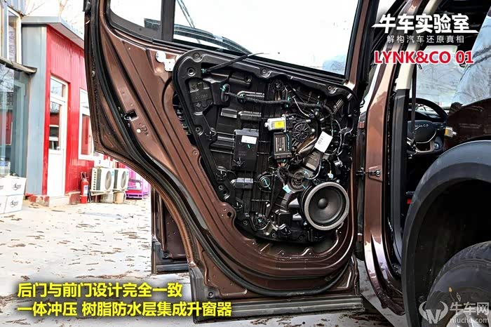 领克01和领克03的后车门都缺少了必要的加强筋结构,领克01的车门内饰板防水层比较高级,整块树脂材料复合板,领克03则是大面积钢板覆盖,用小塑料板封堵孔洞。