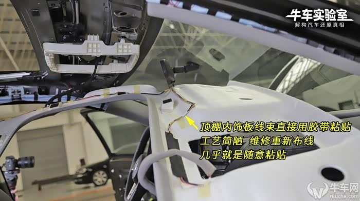 车顶棚内的线束布局也是比较随意,完全手工粘贴胶带固定,甚至都没有专门设计打胶的槽。如果维修顶棚,再重新布线,基本上就是随意贴回去。线束也不存在任何的防护措施。