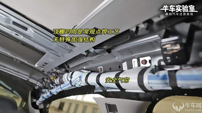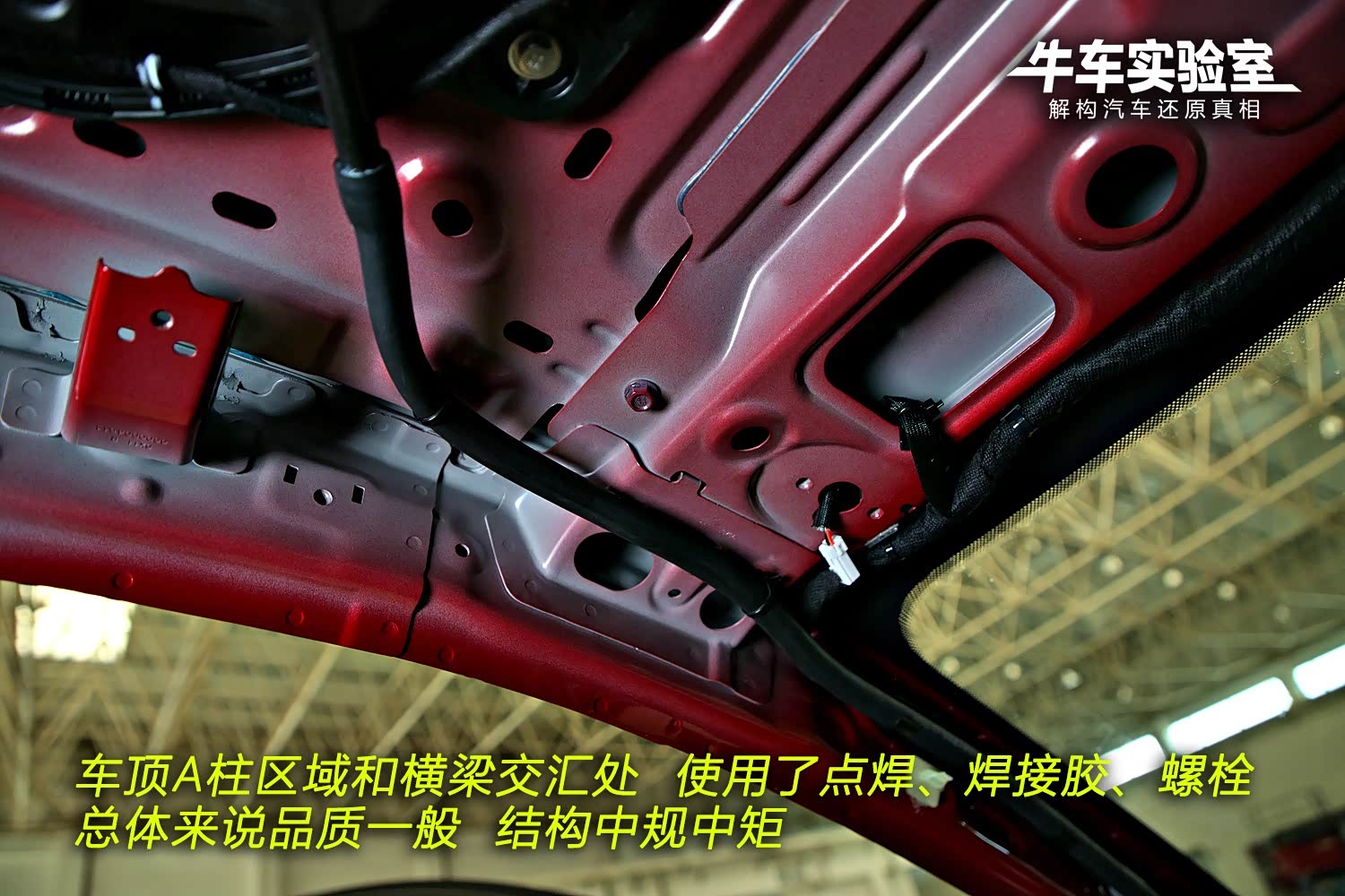 全文总结:吉利缤越,全景天窗边框无加强,C柱上方加强筋。丁基胶止震贴,车顶隔音棉。