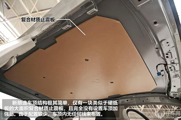 朗逸车顶棚没有任何金属加强梁设计,而是采用了一大块硬纸板复合海绵的止震板。据了解这种硬纸板材质并不是廉价物质,虽然其强度无法和钢材料相提并论,但在隔音止震方面它却表现优秀。不过和传统设计相比,缺少了金属防撞梁总会让人对车顶强度有所担忧。低配车型无天窗,车顶内部也无任何线束布置。车顶两侧以及A、C柱上方金属加强梁也是比较常规的设计,并无专门进行优化。
