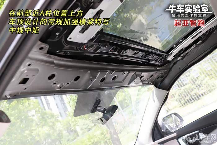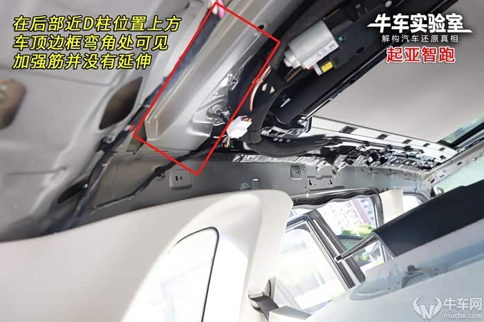起亚智跑为全景天窗设计,B柱上方并无加强处理。车顶棚内部四周也没有特殊加强设计及。在尾部近D柱位置上方,车顶设计有一道比较窄的镂空加强筋结构,算是车顶唯一的附加金属组件。