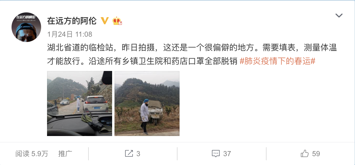 “多年后你该怎么回忆起这个春节?有人无所顾忌微博上评论交火,有人积极转发援助信息,有人坚守自己岗位…无论你是哪一类人,但请记住眼前这些一幕幕真实的,不可回避的痛苦现实,总有人会为之前仆后继地去奋斗 .......”
