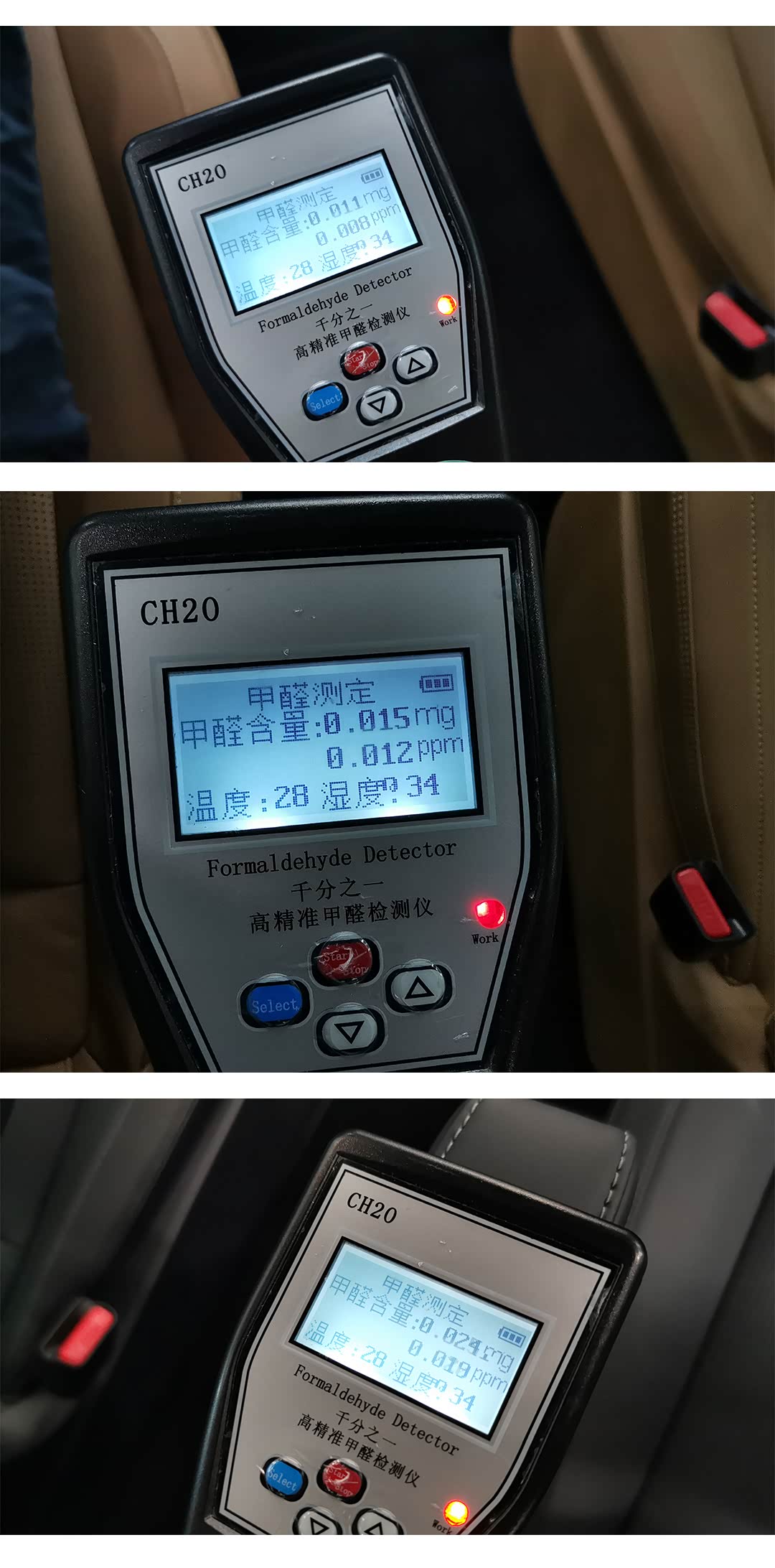 本着对自己和家人健康负责的态度,我本次还专门带上了甲醛测试仪,在现场测试了3台测试车辆(刚下线的新车),关闭所有车窗后密闭3分钟后测试结果分别是0.011mg/m³;0.015mg/m³;0.024mg/m³,这已经远远低于国家0.080mg/m³的标准!对于一台新车,这个数据难能可贵,这就是理想团队在车内环保方面所努力的成果!