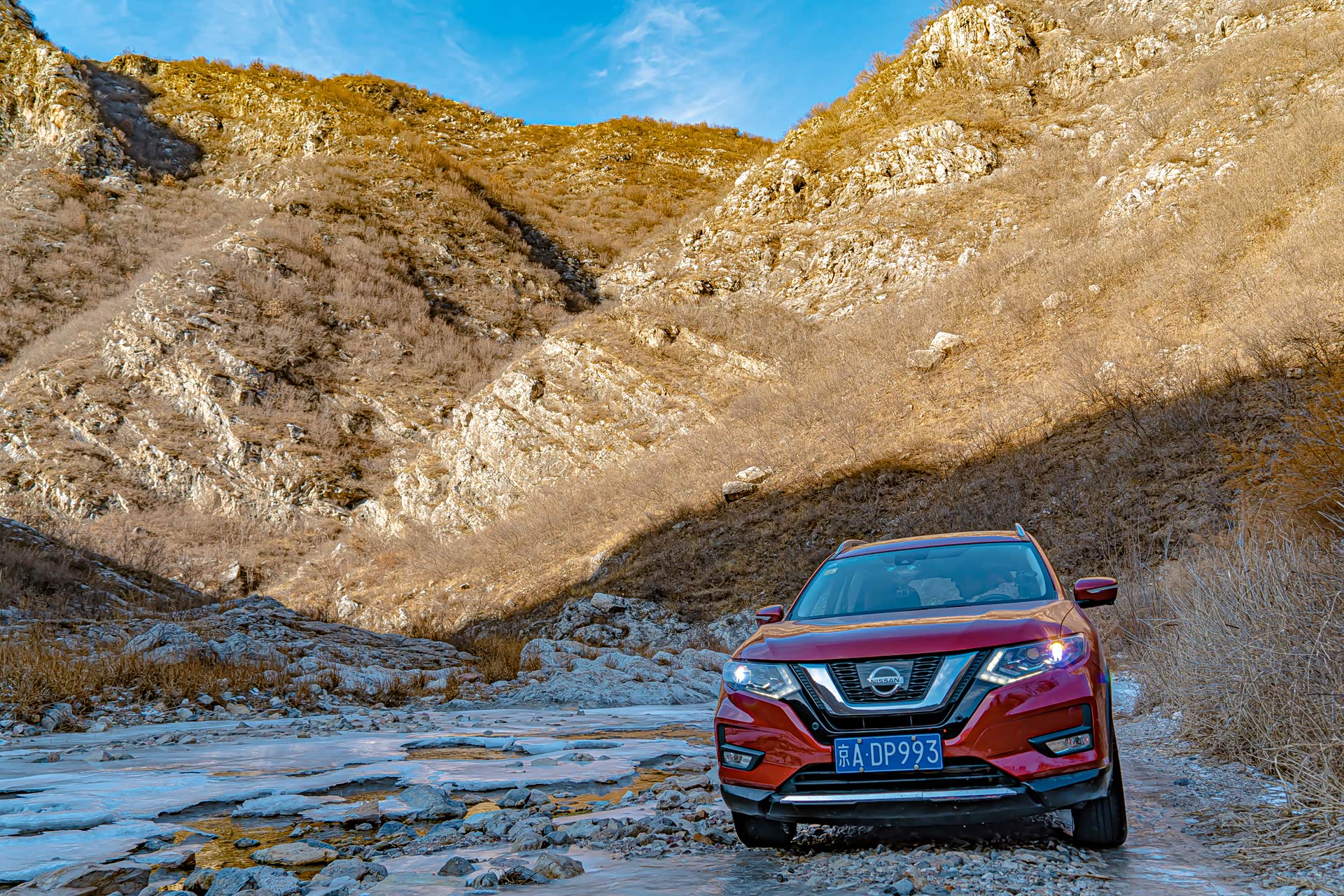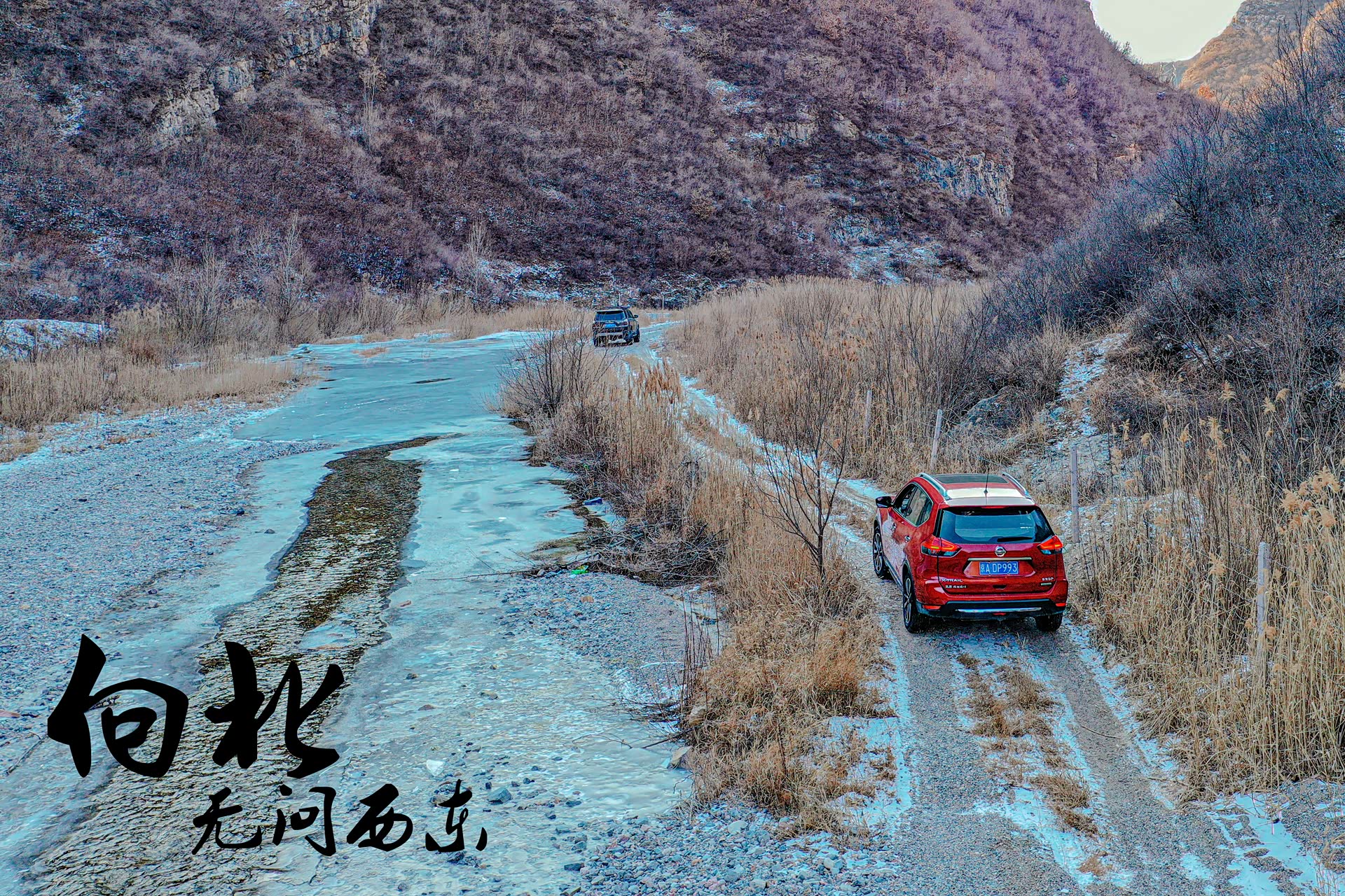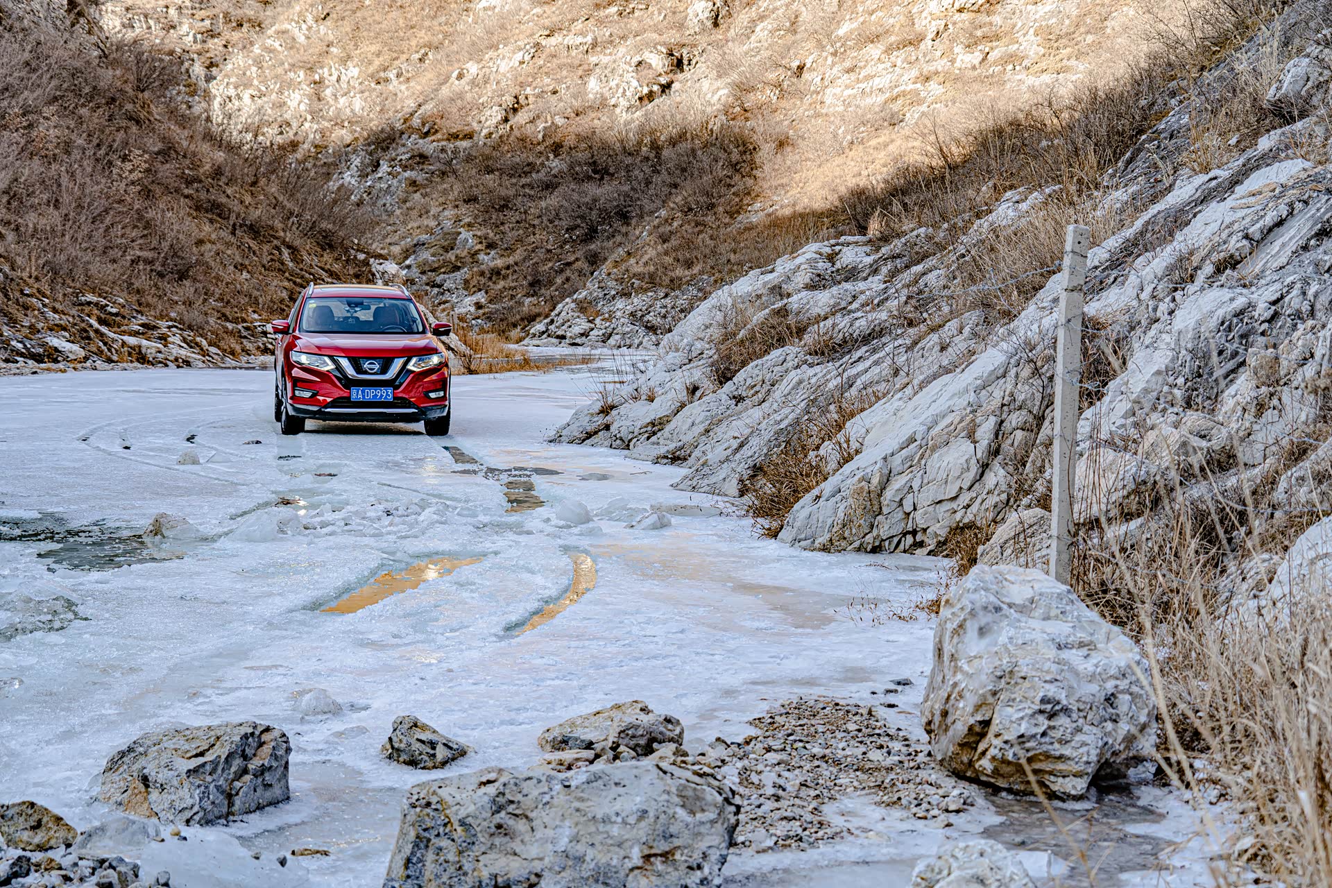 大冰沟在这个初冬很多河面已经解冻,即便是升高改装过的硬派越野车想穿越这里依旧会有很大的风险,所以请感兴趣的小伙伴们尽量在冰冻瓷实了以后再来,另外大冰沟会有一段上山的路程,如果是雪后也不建议往深处穿越。夏天的话难度不大,向奇骏这样带有中差锁的城市SUV也是可以勉强穿越成功的,只是免不了磕磕碰碰或者车里会进些水,去的话也一定要注意安全。