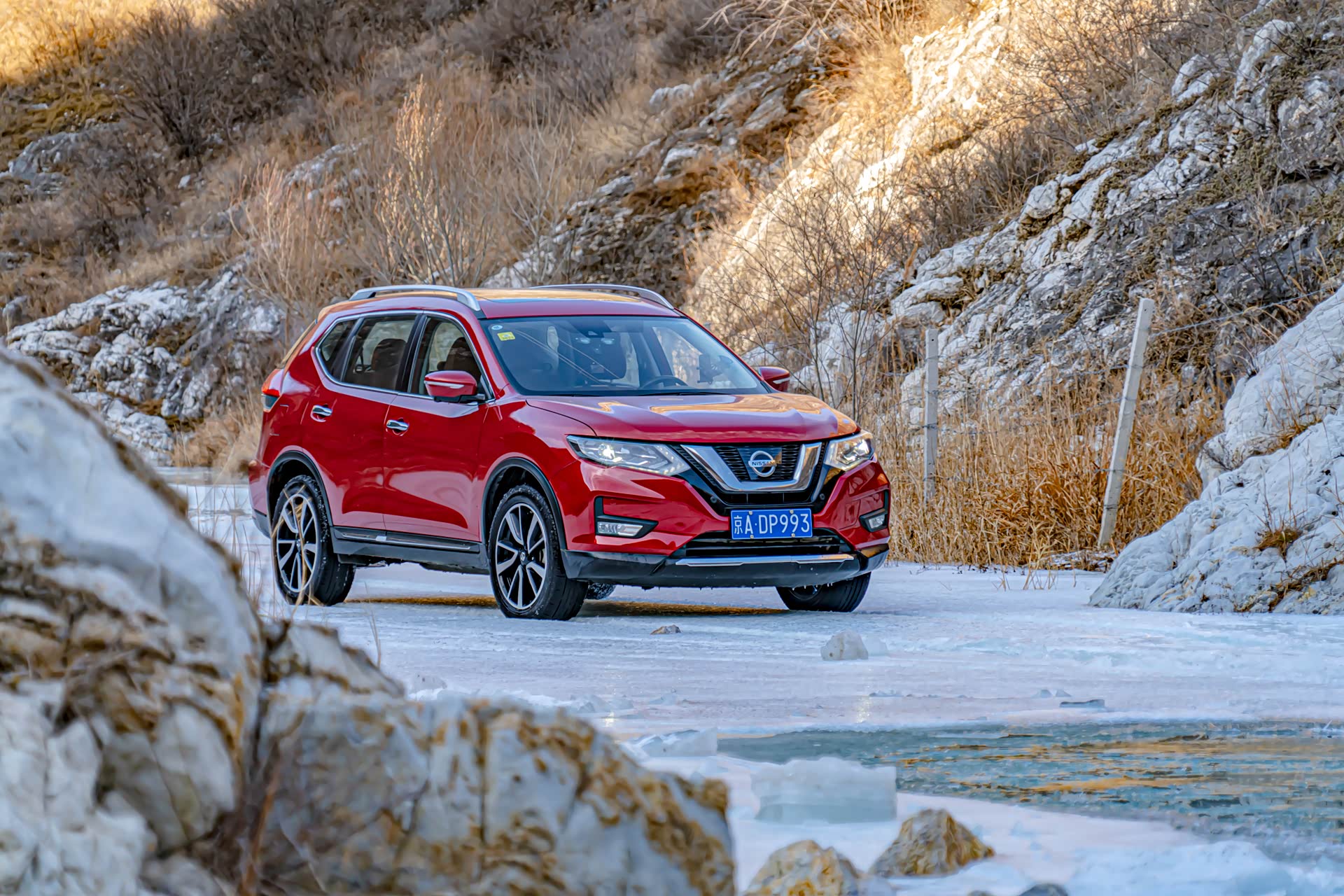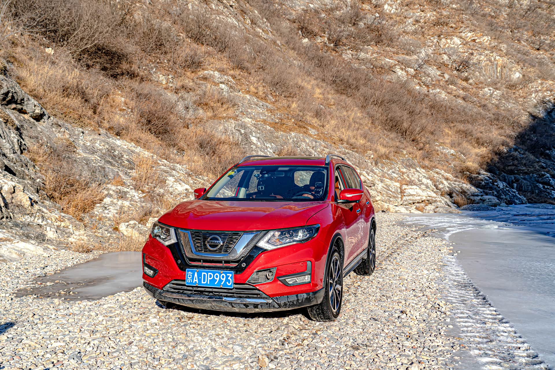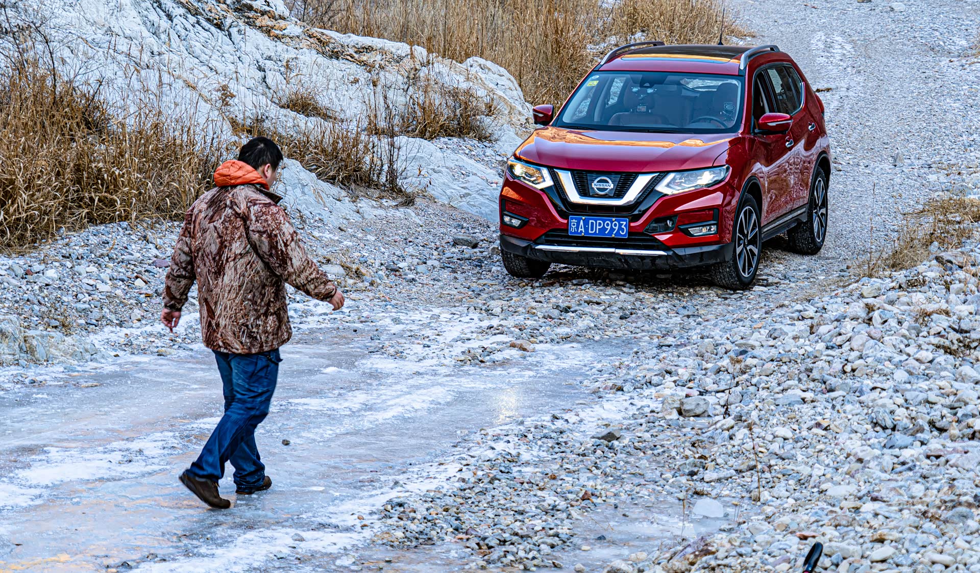 在冰河面前有一条坚实的陆路,但是需要跨过这几块超大的石头,从照片上基本就可以看出来,未经过改装的奇骏肯定是过不去。