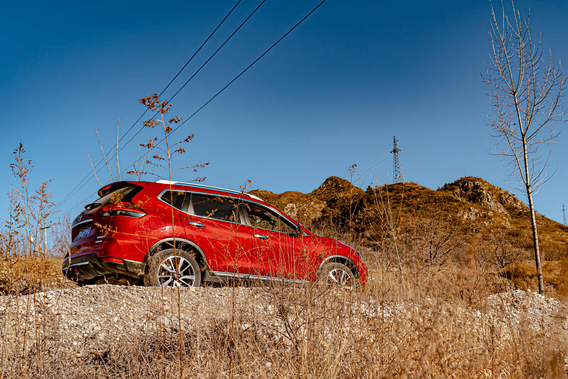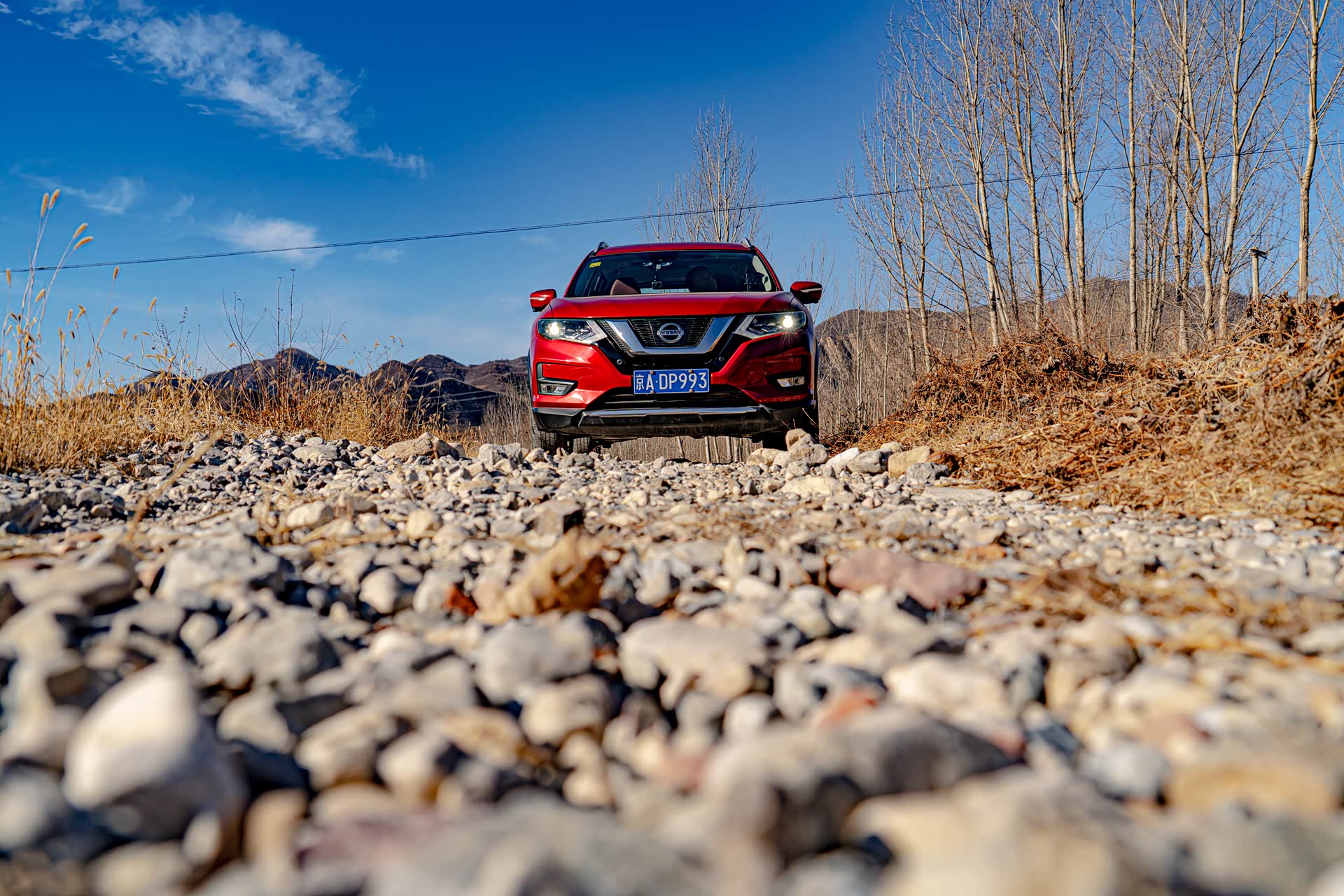 从这两张照片可以看出来,石头非常高,凭奇骏的接近角和通过角是不能无损通过的,看来也没有别的办法,只能用更多的石头来给奇骏“搭”出一条路来。