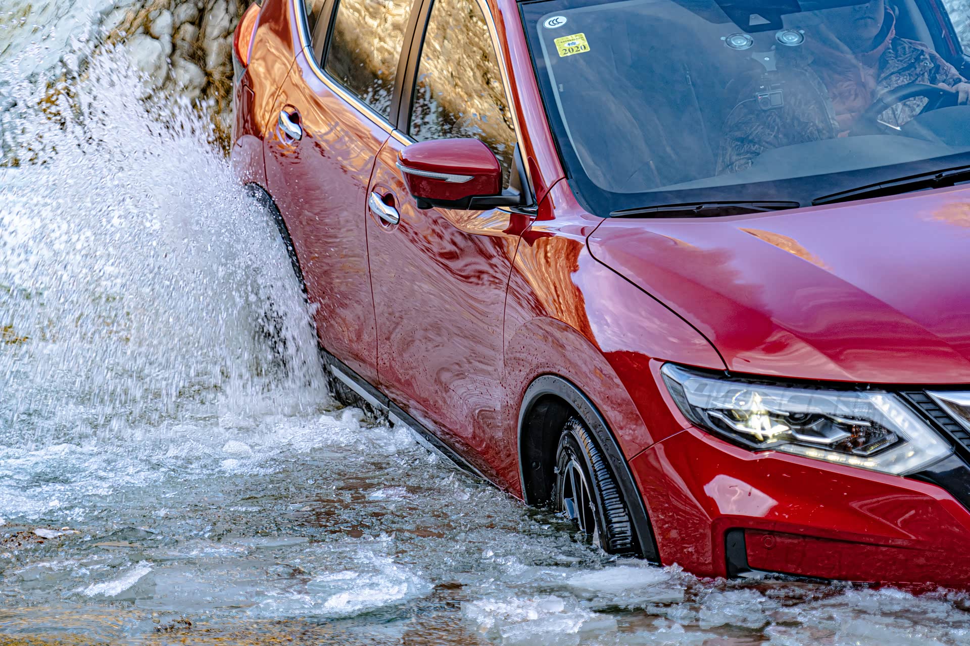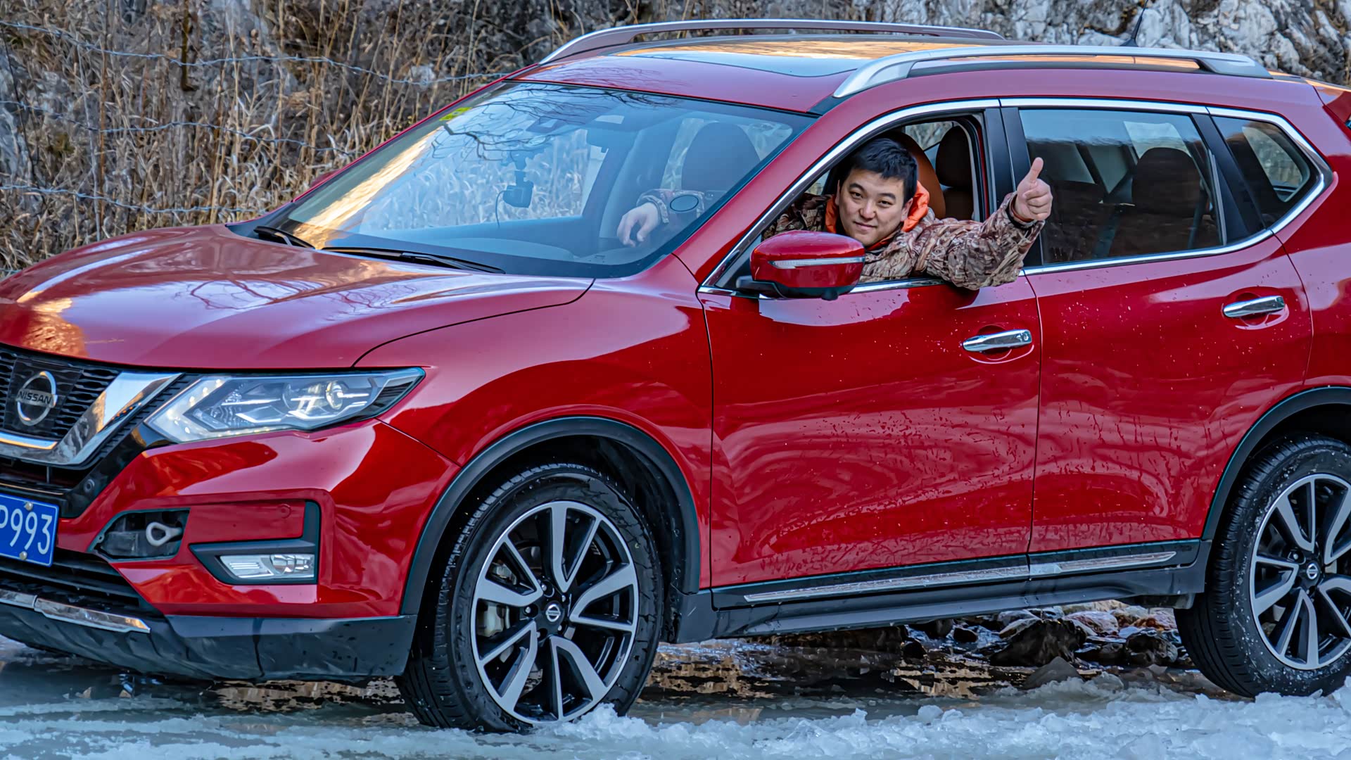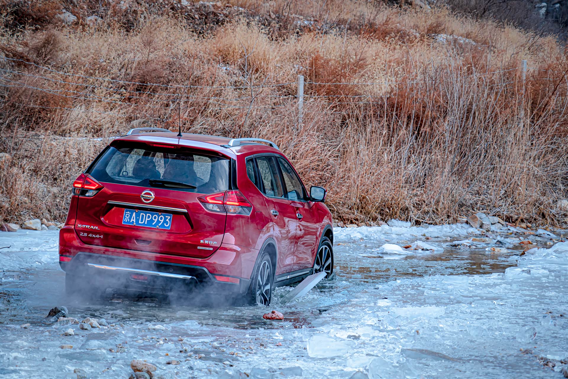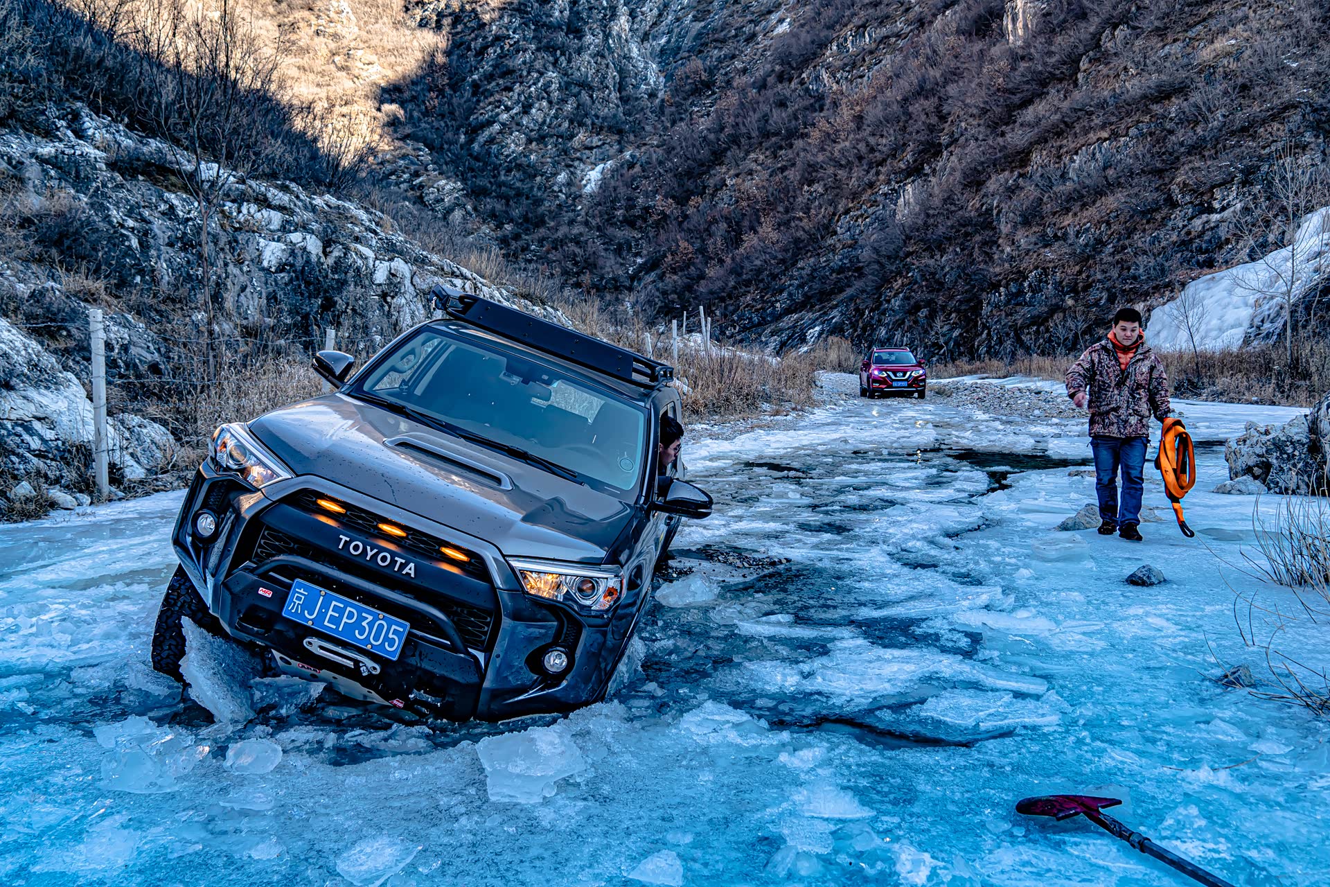 刚进入冰河的时候还比较顺利,就在即将踏上冰面之上的时候,图中右侧的冰突然塌陷,好消息是就在冰面塌陷的一瞬间,奇骏靠着动力冲了上来,此时对于这台奇骏来说,已经是它的最强越野模式了。前杠略有破损,好在不严重,另外在河里的时候车子有点进水了。