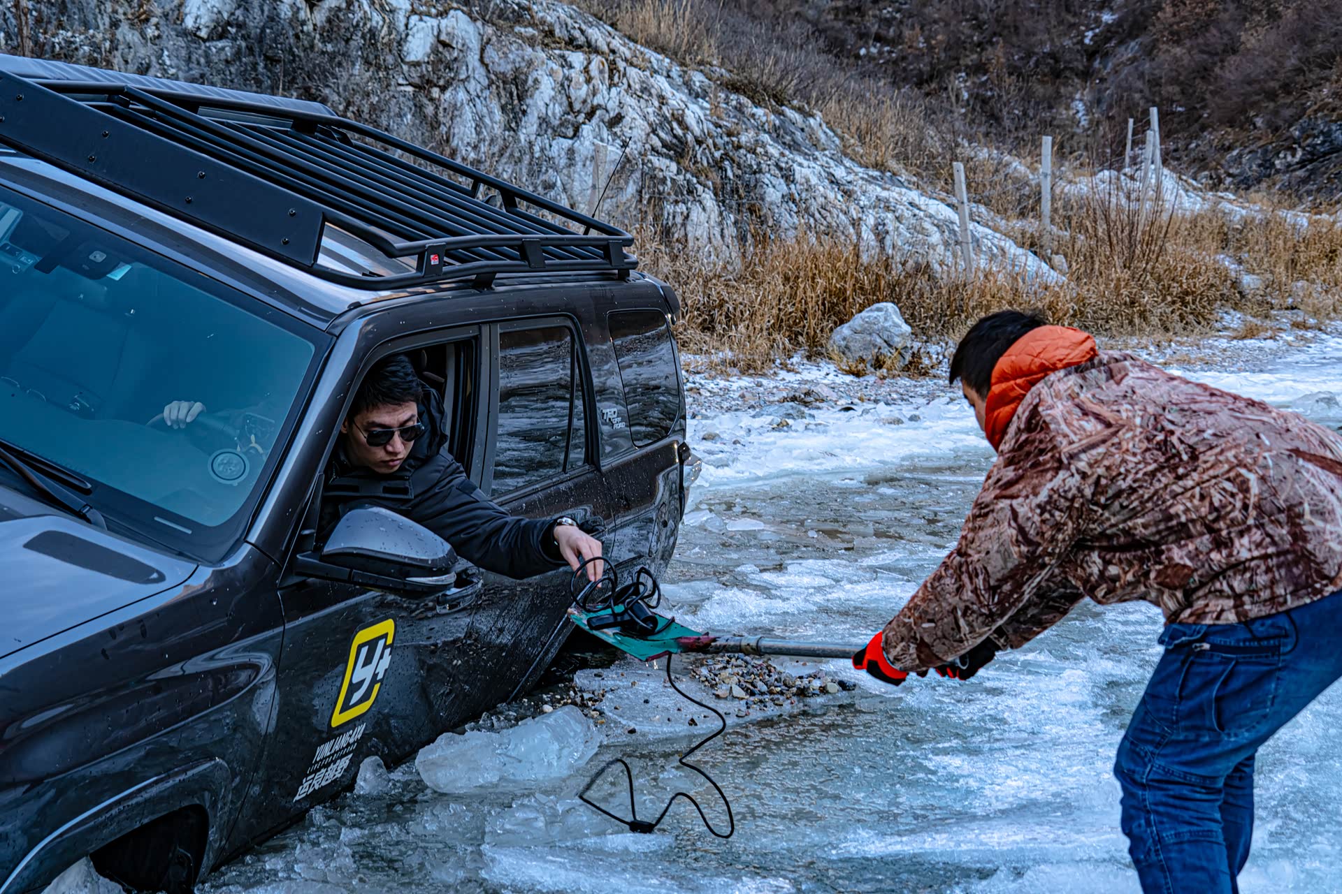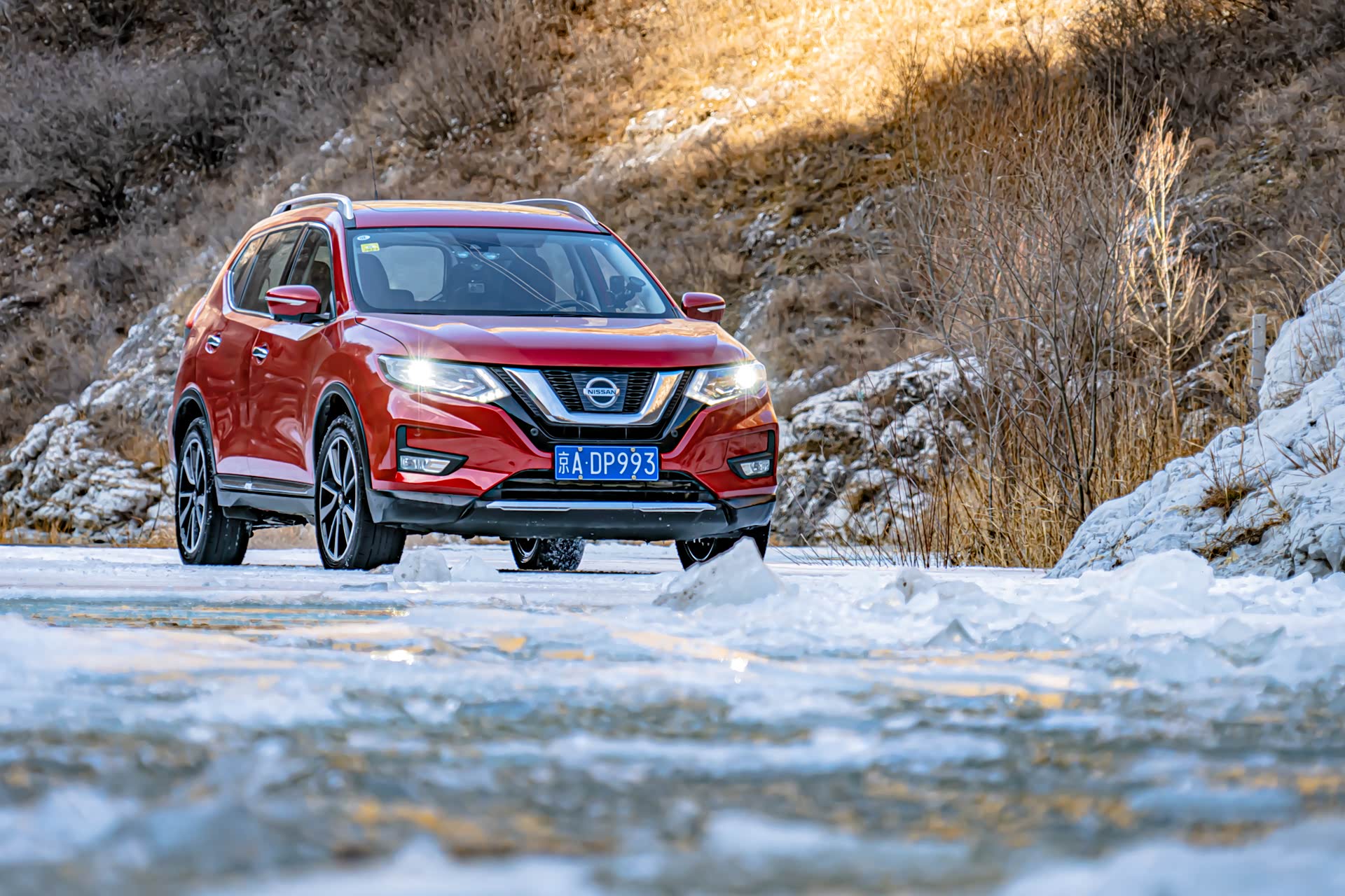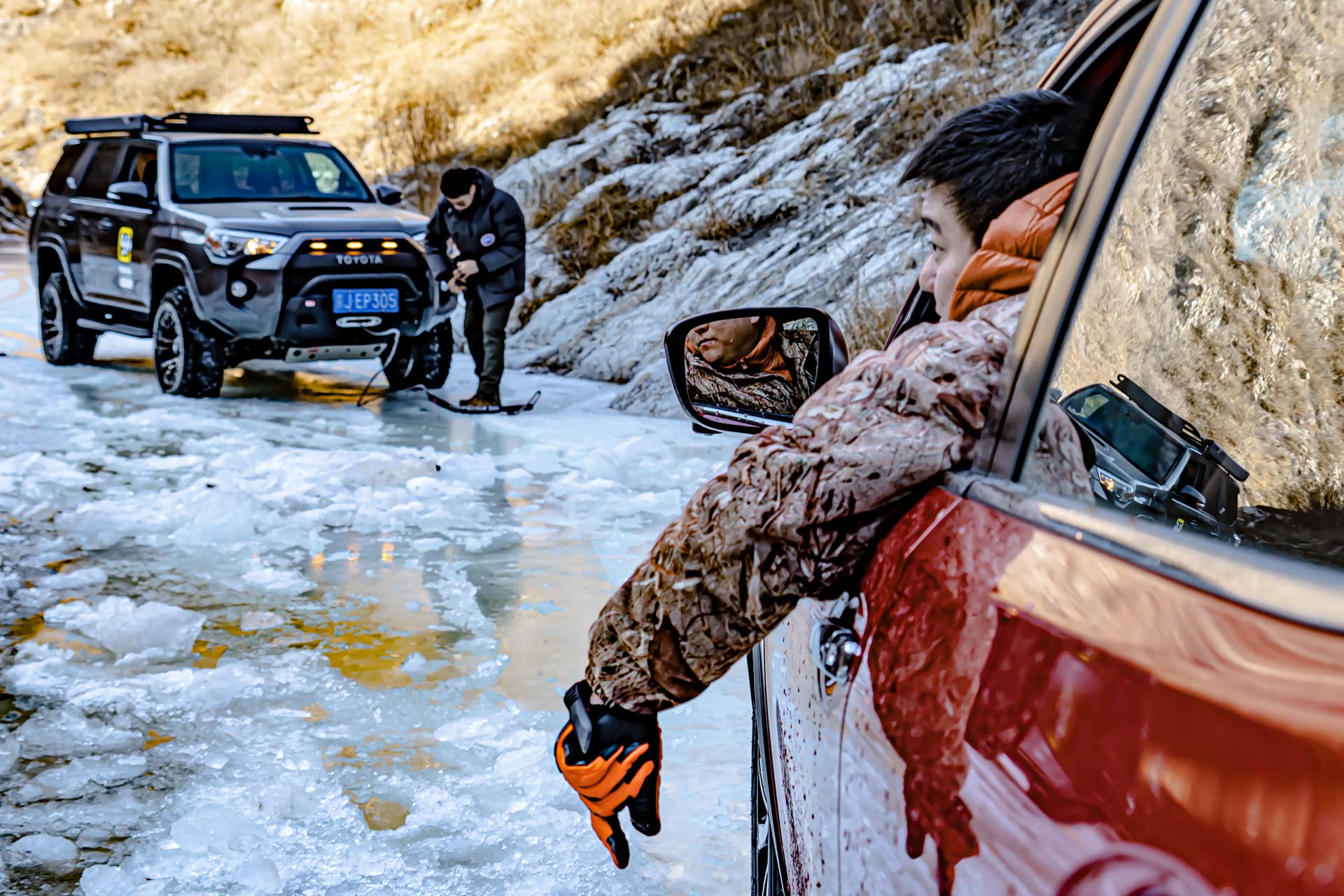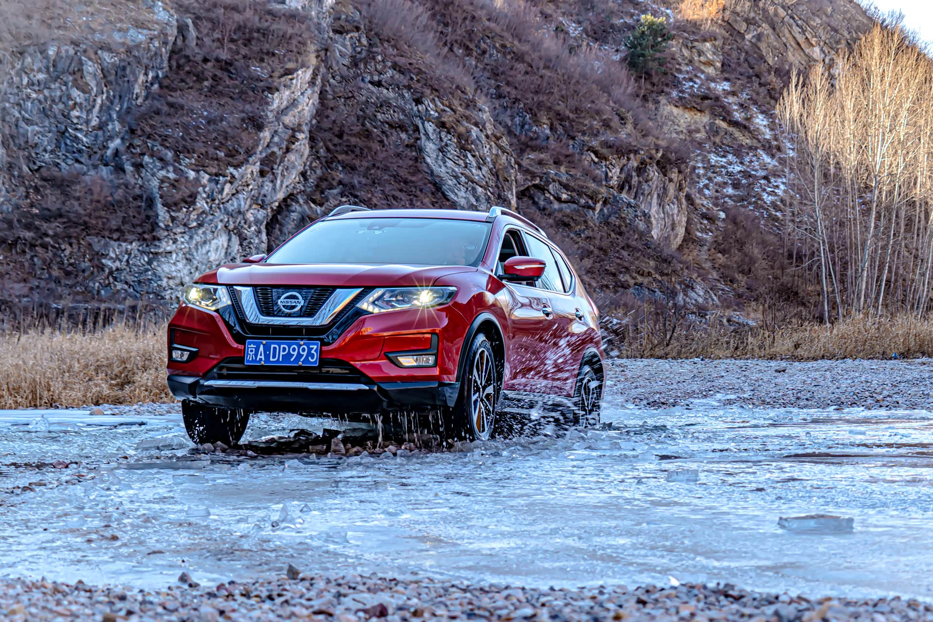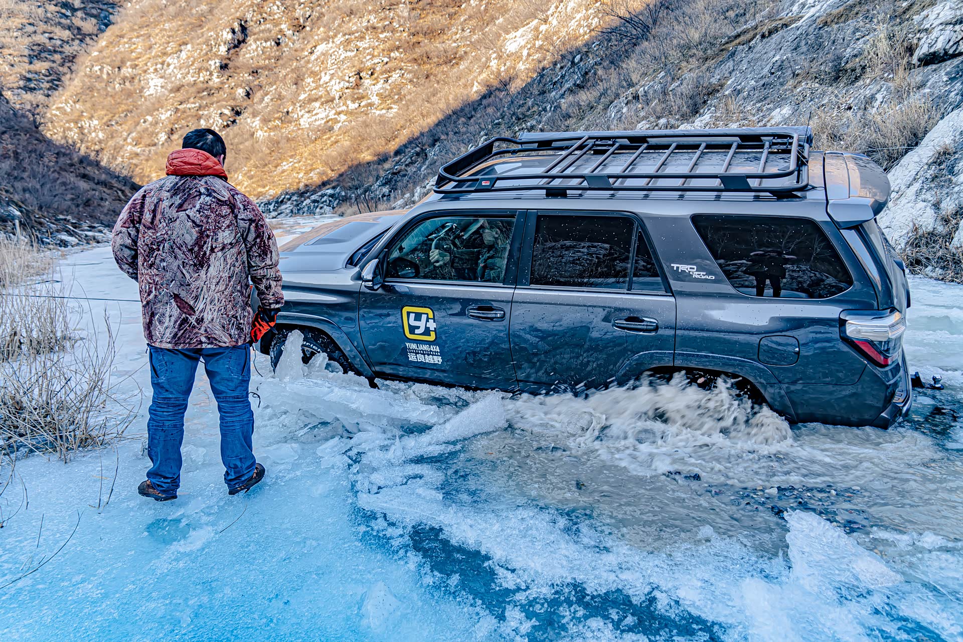 刚进入冰河的时候还比较顺利,就在即将踏上冰面之上的时候,图中右侧的冰突然塌陷,好消息是就在冰面塌陷的一瞬间,奇骏靠着动力冲了上来,此时对于这台奇骏来说,已经是它的最强越野模式了。前杠略有破损,好在不严重,另外在河里的时候车子有点进水了。