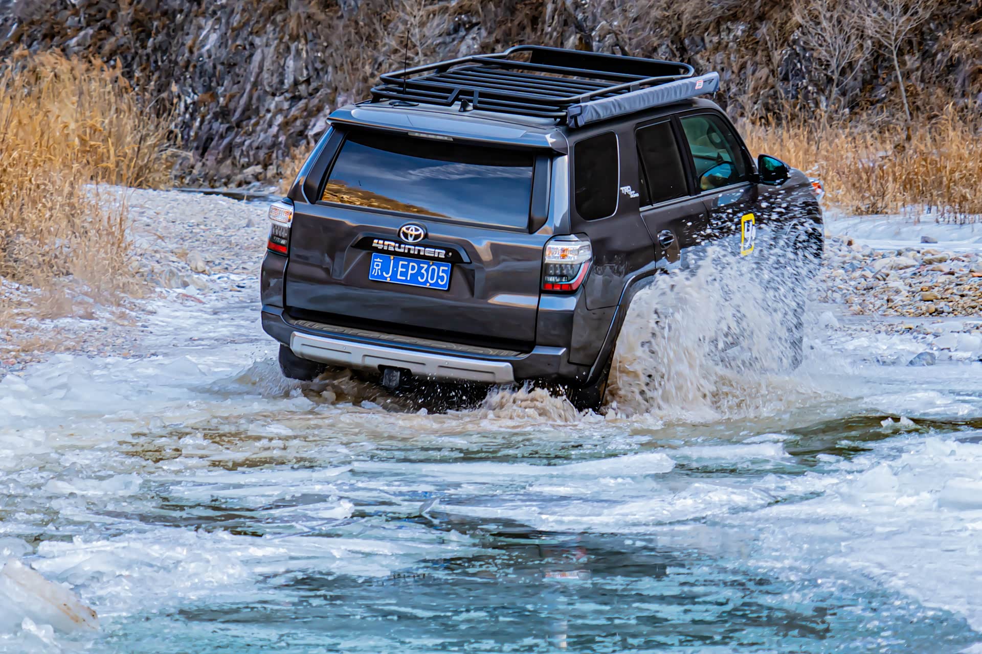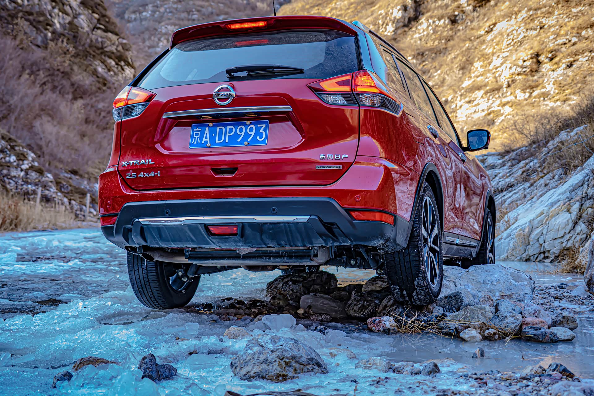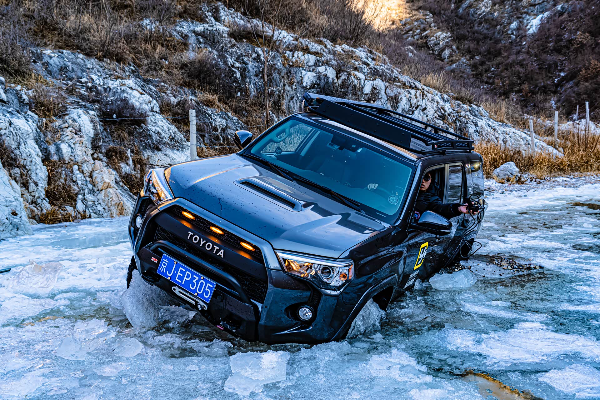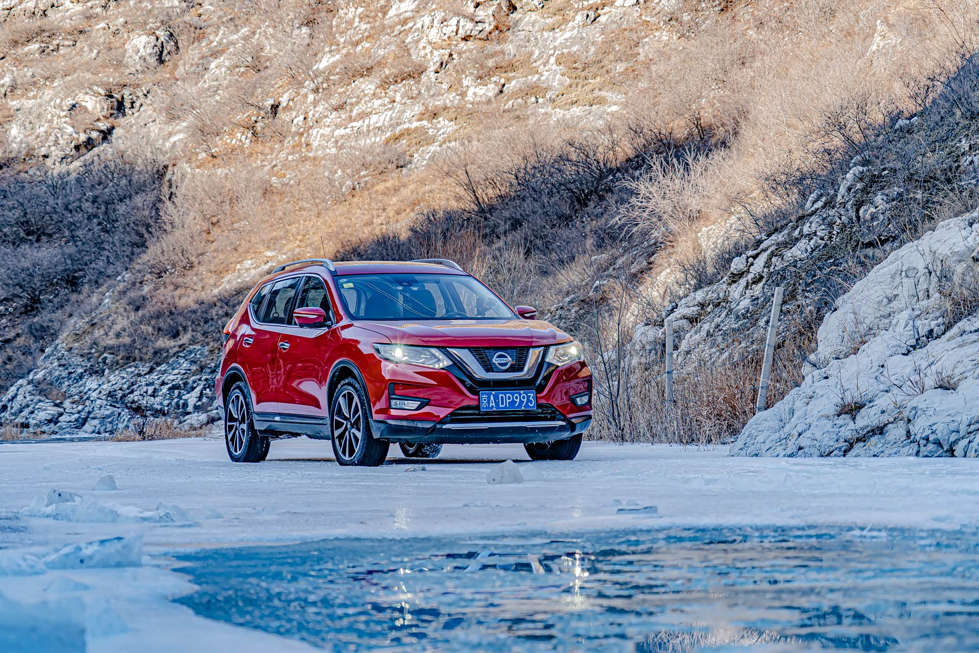 刚进入冰河的时候还比较顺利,就在即将踏上冰面之上的时候,图中右侧的冰突然塌陷,好消息是就在冰面塌陷的一瞬间,奇骏靠着动力冲了上来,此时对于这台奇骏来说,已经是它的最强越野模式了。前杠略有破损,好在不严重,另外在河里的时候车子有点进水了。