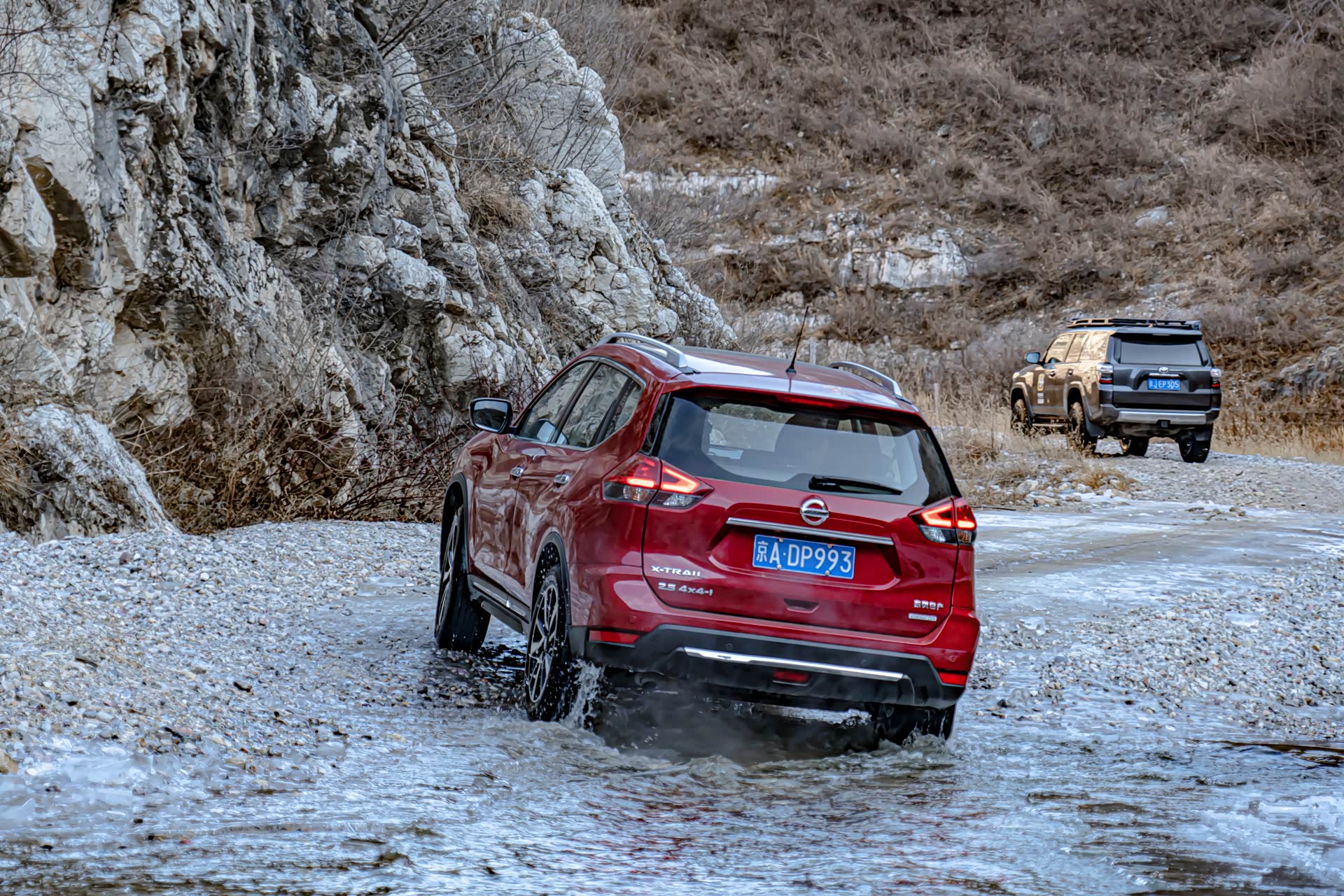 四跑在前面探路,我会根据它轮子没入水中的深度决定奇骏要走的路线,本着能不走水就不走水的原则寻路前行。