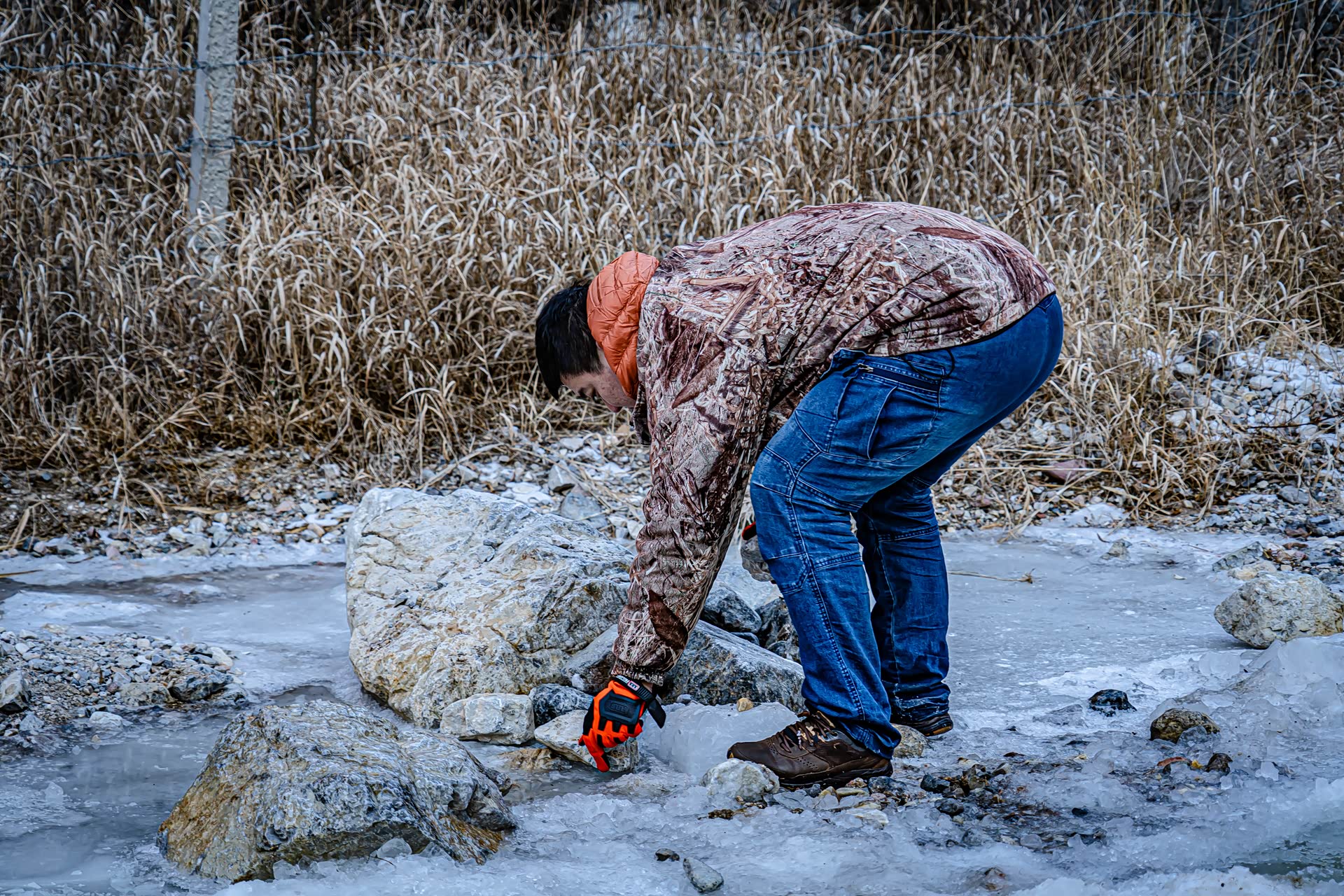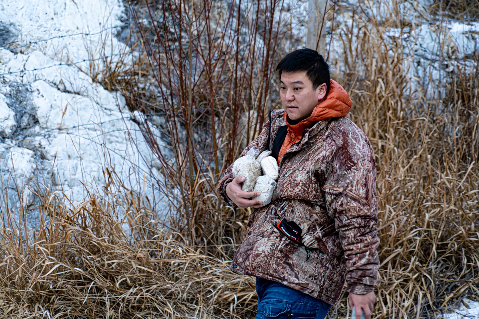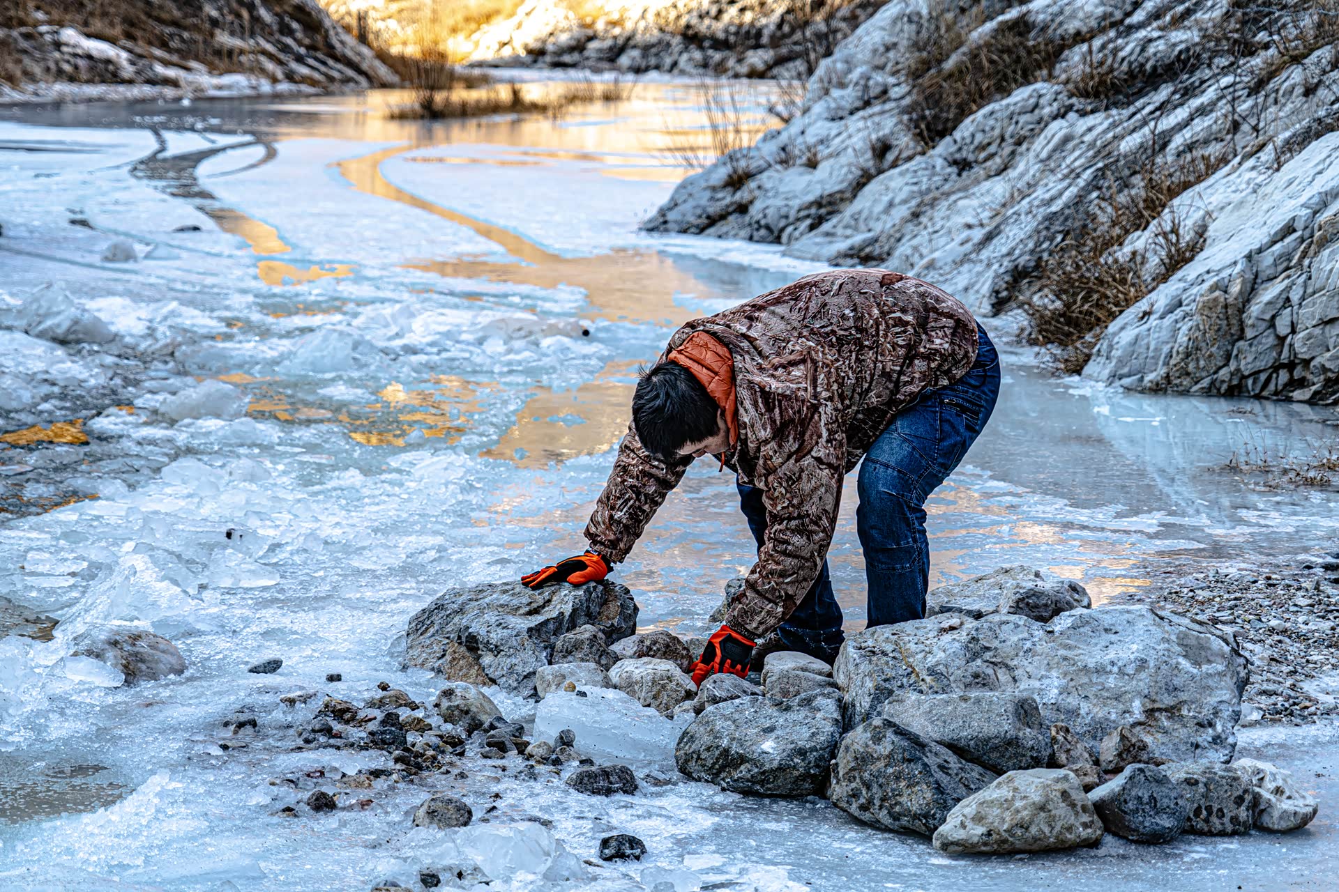 小伙伴们几次三番的从远处把大小不一的石头运送过来,途中在滑溜的冰面上不知多少次险些摔倒,好在把这条石头路顺利的搭建成功,足足用了1个多小时。
