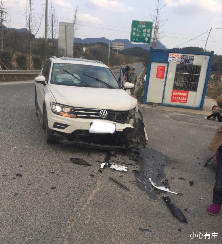 接下来我们再观察下大众途观L的受损情况,可以看到这辆大众由于车身比较高,占据了一定优势,所以损失情况并不大。除了左侧的保险杠、中网、大灯、叶子板、防撞梁和玻璃水壶等配件被撞毁之外,其他车身大件都没有受到太多的影响,整体问题不大。