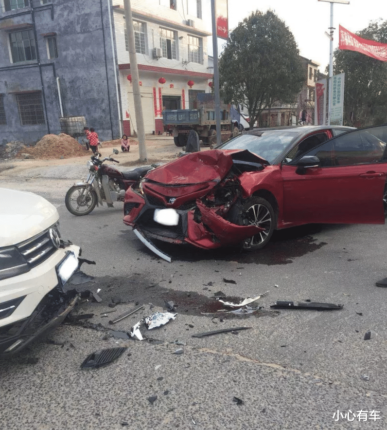 图片中,现场两辆车均有着不同程度的受损,其中丰田凯美瑞的损失情况相对严重一些。可以看到,这辆凯美瑞的车头部分已经被撞得面目全非,前面的保险杠、大灯、叶子板和发动机盖等覆盖件都被撞毁,防撞梁、吸能盒和左侧大梁估计都已经严重变形。另外,地上留下了一摊液体,看样子水箱和发动机也都受到了影响,损失确实惨重!不过比较幸运的是,凯美瑞的A柱依旧纹丝不动,而且车门还能够正常打开,因此车上的人员才能够全身而退。