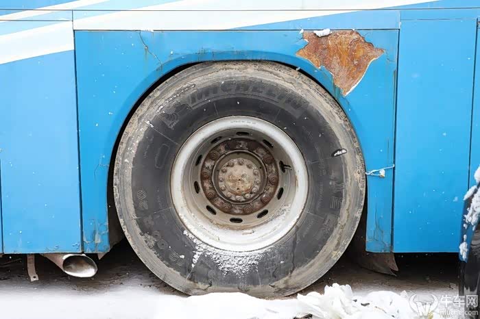 12.00子午线轮胎,上方的轮拱明显重新更换过,不仅存在色差,并且已是锈迹斑斑。而周围的原装铝车身却完好无损,维修件的老化速度比原装件还要快,这也是铝制车身高耐用性的又一佐证。