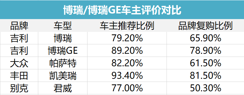 89.2%的车主愿意向朋友推荐博瑞GE,78.9%的车主未来换车时,也会继续考虑吉利品牌。这样的反馈,对比一下同级别合资车型,又是怎样的情况呢?