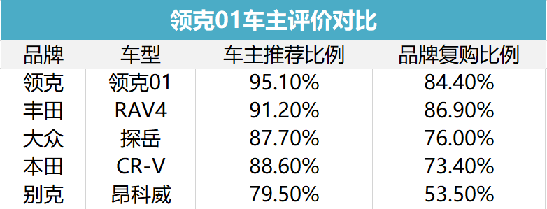 由此可见,虽然领克01并非完美,但是车主满意度却非常高,几乎压制住了丰田RAV4,超过了本田CR-V。看到这你可能会说,车主满意度高只是因为领克的车主规模比较小,不具有充分的代表性。