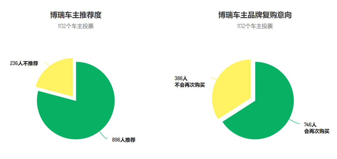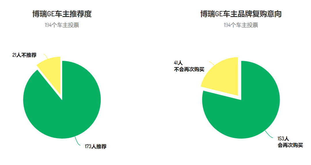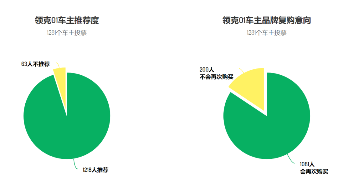 至于车主是否后悔,上面两个图就一目了然了。1218位车主,95.1%愿意向朋友推荐,84.4%会考虑再次购买领克品牌。这样的综合满意度,已经不逊于很多日系车型。