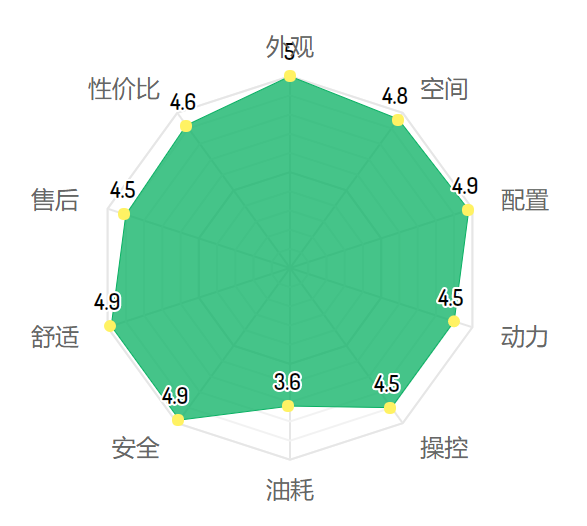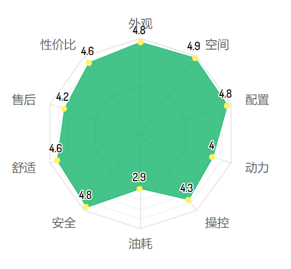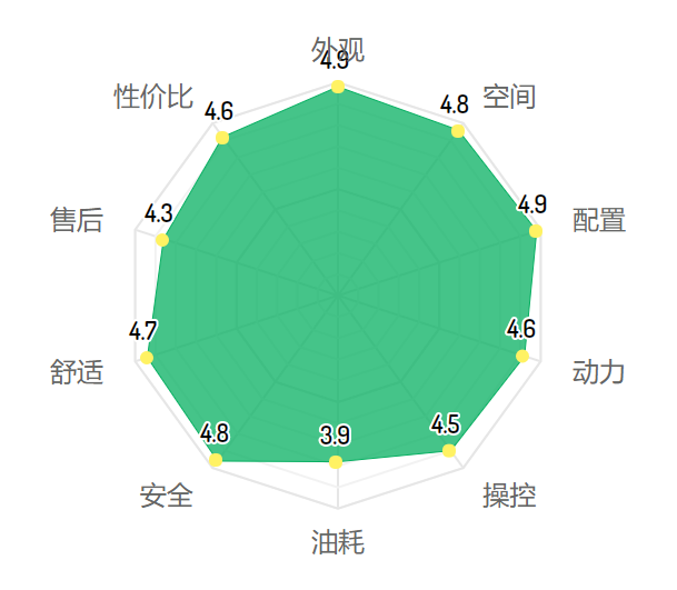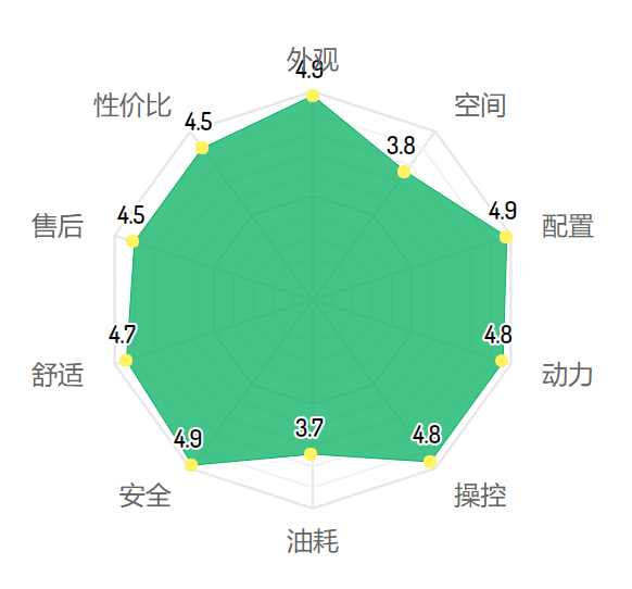 车主满意度里,一共有2110个车主打分,雷达图一共计入了外观、空间、配置、动力、操控、油耗、安全、舒适、售后和性价比10个项目,其中满意度最高的,是外观、空间、配置和安全,博瑞都获得了4.8分以上的综合成绩。而在性价比和舒适度层面,也获得了4.6分的优秀反馈。