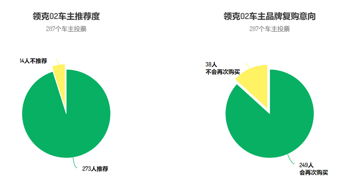 不过,这并没有影响到车主对02的整体满意度。287个车主中,95.1%愿意向朋友推荐02,而未来依然会考虑领克品牌的车主比例,达到了86.8%。