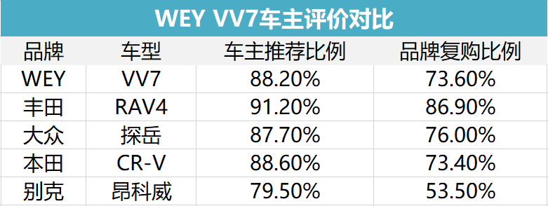 不过整体而言,VV7的综合满意度还是不错的,车主推荐度88.2%,品牌复购指数73.6%,和领克01相比差距比较明显,但是和同价位的其它车型相比,算得上中规中矩: