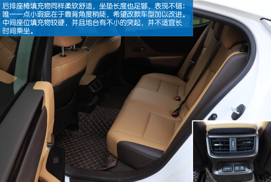 ES200前排座椅虽然使用仿皮材质,但触感和柔软度都还不错,宽大的座椅也非常柔软舒适。之前在试驾同为TNGA架构的亚洲龙时,前排座椅头部空间不足的问题,并未出现在雷克萨斯ES上,打消了我的顾虑。我个人稍稍有一些驼背,乘坐很多车辆驾驶座时,座椅的肩部和头枕基本都起不到支撑作用,ES200的座椅在这点做的也比较好。并且这台ES200豪华型还配备座椅加热和通风功能,可以自动调节,非常不错。当然前排座椅方面也不是没有缺点,如果坐垫长度再加长一些就更好了,要知道上一代ES200的高配车型前排座椅就可以电动调节坐垫长短,新款简配这项配置比较遗憾。
