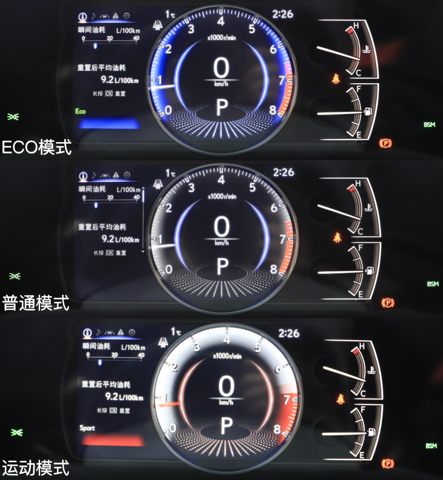 仪表盘使用了机械仪表和液晶仪表相结合的方式,凡是有屏幕的区域,都为彩色显示。整体组合的效果我认为效果也很不错。随着驾驶模式的切换,显示界面会有相应调整,虽然变化不大,但相信也能够满足大部分驾驶员的需求。