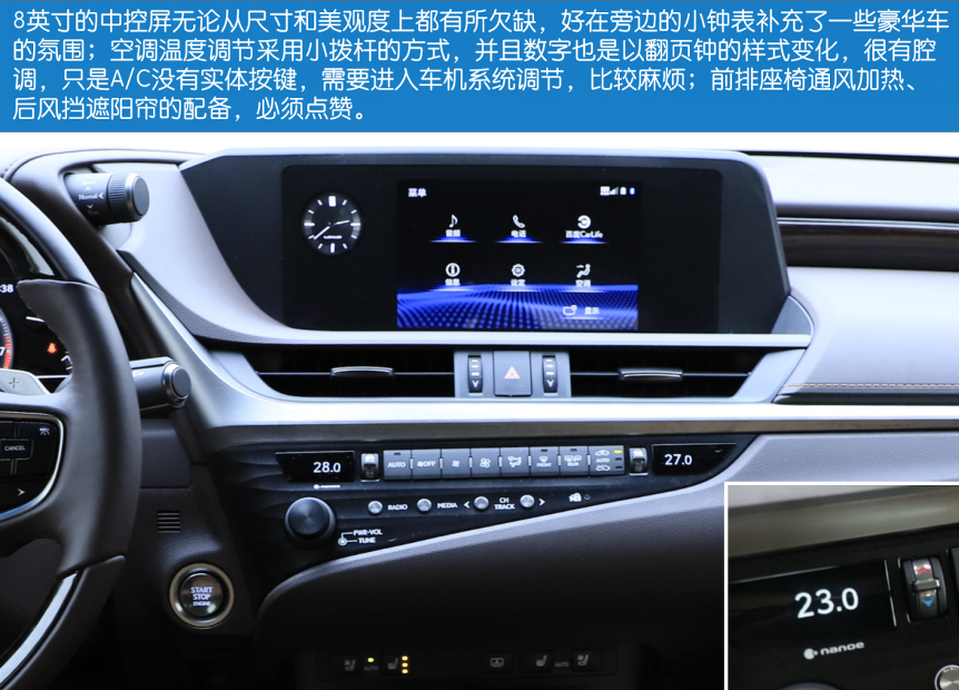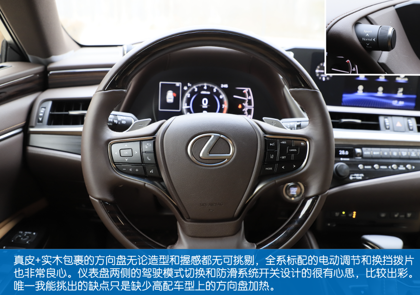 从驾驶员的观感来说,仪表台上方最直观的部分使用了柔软的真皮包裹,两侧分别是ESP和驾驶模式调节的旋钮,也只有雷克萨斯能够想到把这些功能以这样的方式放在仪表台上,很别致。方向盘的造型、尺寸和触感都无可挑剔,实木与真皮的搭配即典雅又温润,如果挑毛病的话,方向盘加热的缺失,是我能想到的唯一一个了。