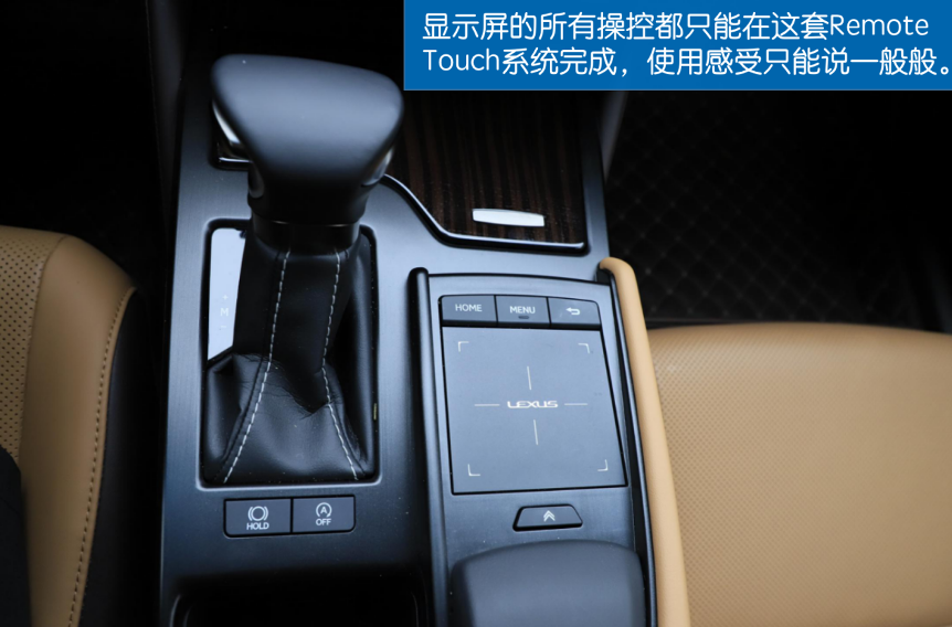 内饰方面我最不满意的就是这套车机系统,屏幕采用一块8英寸液晶屏,有些偏小,高配车型为12.3英寸,车机系统的界面相对也比较传统,配色单一,手机互联方面只支持百度Cailife,没有苹果CarPlay,同样也不支持车联网等等时髦功能。吐槽还没有结束,这套车机系统只能由档把旁边的Remote Touch 触控板控制,类似于鼠标功能,虽然光标切换到不同区域时触控板会有震动提醒,但在选择一些比较小尺寸的功能模块时需要手指滑动比较精确,有时要重复操作才能成功。所以希望雷克萨斯在改款车型上重新投放一套更好用的车机系统。