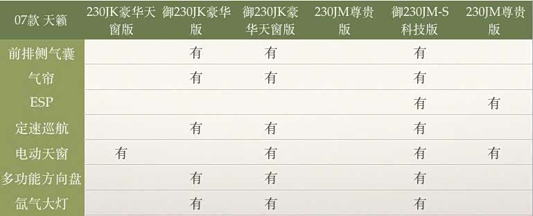 07款天籁有六个配置:230JK豪华天窗版、御230JK豪华版、御230JK豪华天窗版、230JM尊贵版、御230JM-S科技版、230JM尊贵版