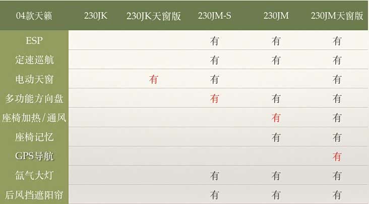 04款天籁230有五个配置:230JK、230JK天窗版、230JM-S、230JM、230JM