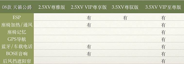 08款天籁公爵有四个配置:2.5XV尊雅版、2.5XV VIP尊享版、3.5XV尊驭版、3.5XV VIP至尊版