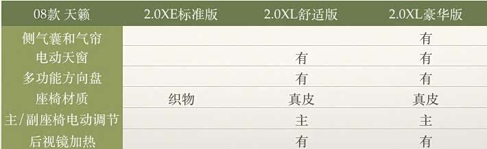 08款天籁有三个配置:2.0XE标准版、2.0XL舒适版、2.0XL豪华版