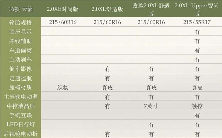 16款天籁有四个配置:2.0XE时尚版、2.0XL舒适版、改款2.0XL舒适版、2.0XL-Upper智尚版