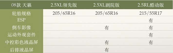 08款天籁有三个配置:2.5XL领先版、2.5XL剧院版、2.5RL酷动版