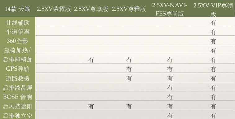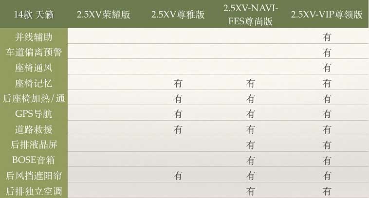 14款天籁公爵有五个配置:2.5XV荣耀版、2.5XV尊享版、2.5XV尊雅版、2.5XV-NAVI-FES尊尚版、2.5XV-VIP尊领版