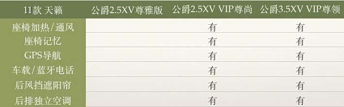 11款天籁公爵有三个配置:公爵2.5XV尊雅版、公爵2.5XV VIP尊尚版、公爵3.5XV VIP尊领版