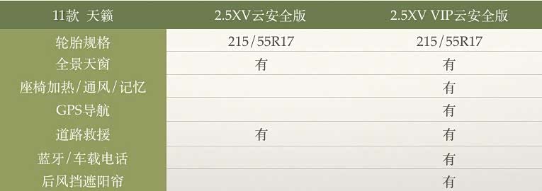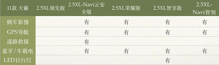 11款天籁有七个配置:2.5XL领先版、2.5XL-Navi云安全版、2.5XL荣耀版、2.5XL智享版、2.5XL-Navi智领版、2.5XV云安全版、2.5XV VIP云安全版