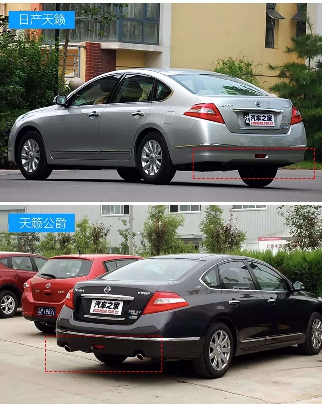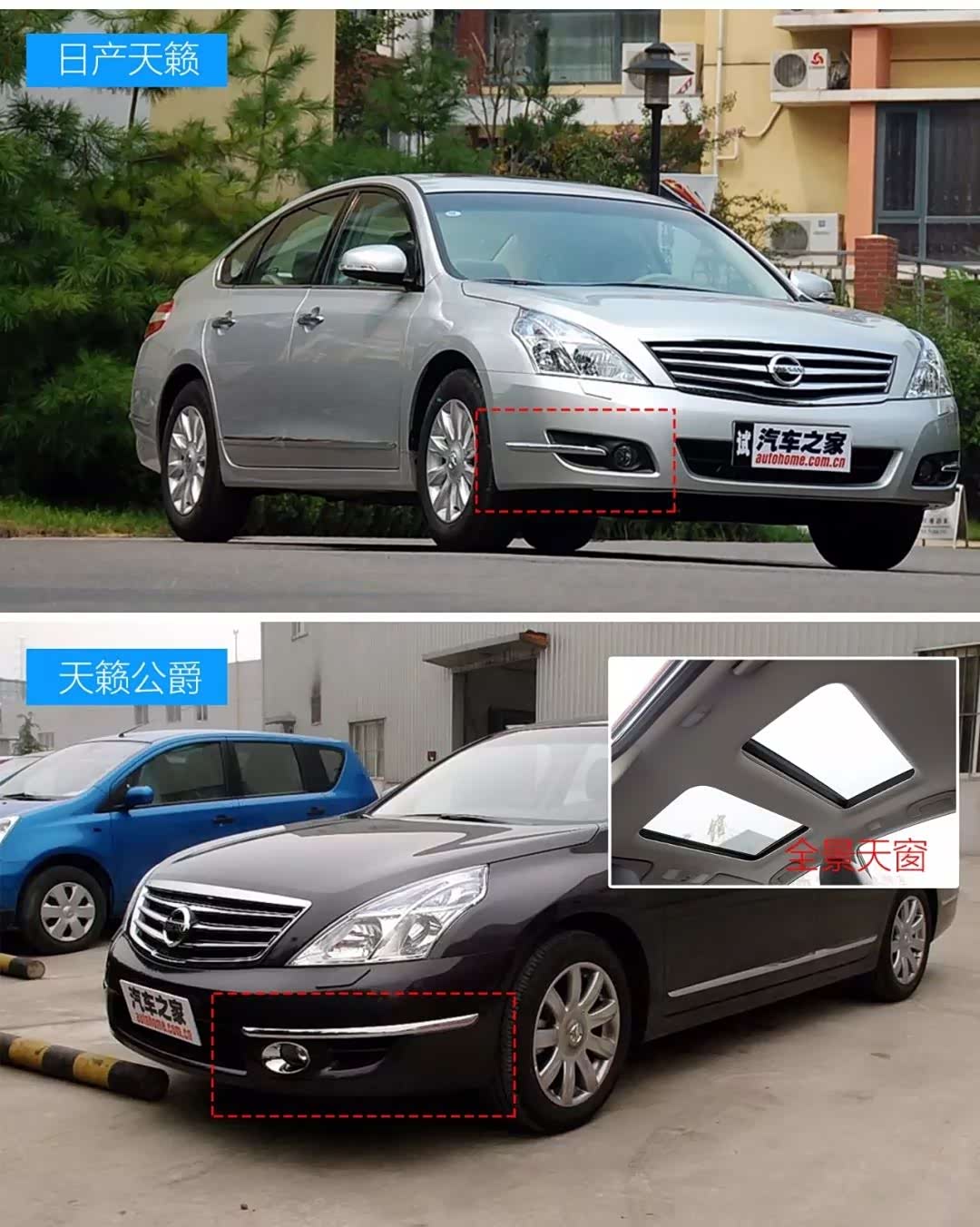 天籁和天籁公爵的主要区别:全景天窗、保险杠镀铬饰条、方形排气管