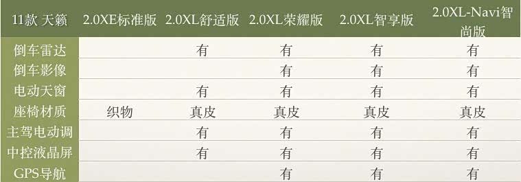 11款天籁有五个配置:2.0XE标准版、2.0XL舒适版、2.0XL荣耀版、2.0XL智享版、2.0XL-Navi智尚版