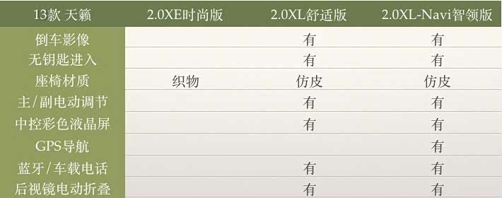 13款天籁有三个配置:2.0XE时尚版、2.0XL舒适版、2.0XL-Navi智领版